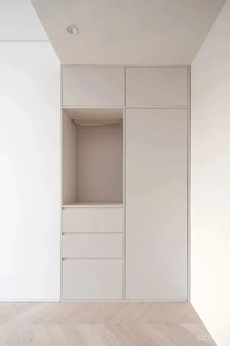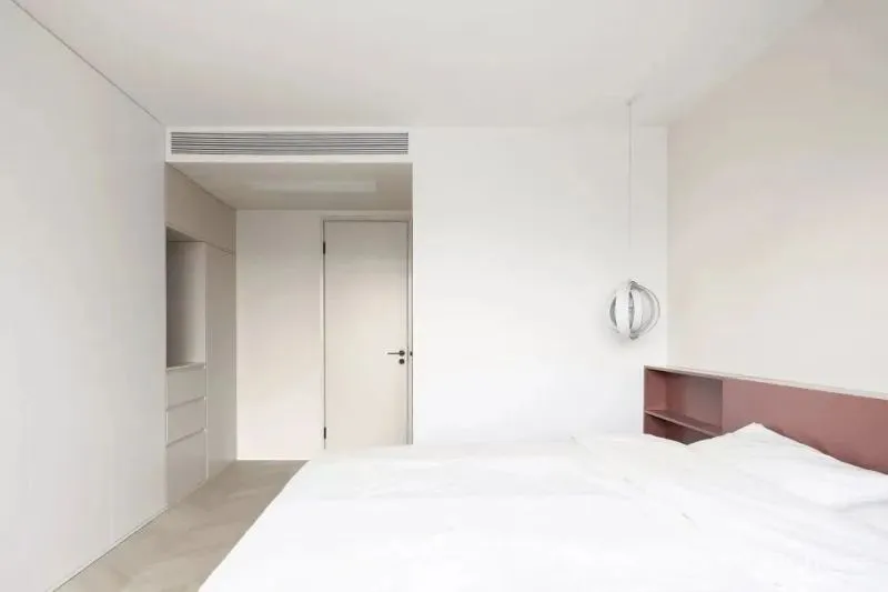 卧室延续了公共空间的要素。明晰的空间几何划分出不同的功能区域。整体呈现出一个简练纯净的就寝环境。低饱和度的暖色配色以及泛光灯带增加了卧室的温馨氛围。