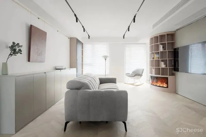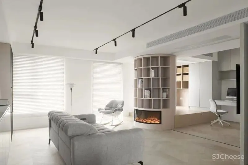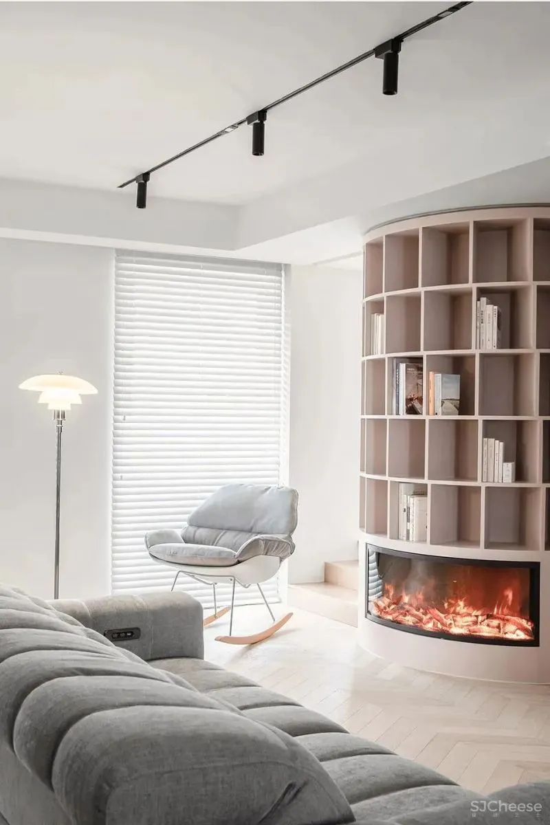 观影区的双人沙发和单人沙发椅围绕书架装置摆放。书架下侧的仿真壁炉强化了书架在空间中的核心角色并且为整个家庭公共空间营造了温馨氛围。壁炉这一传统符号在这个现代空间中形成的冲突感也让整个空间更有趣味。