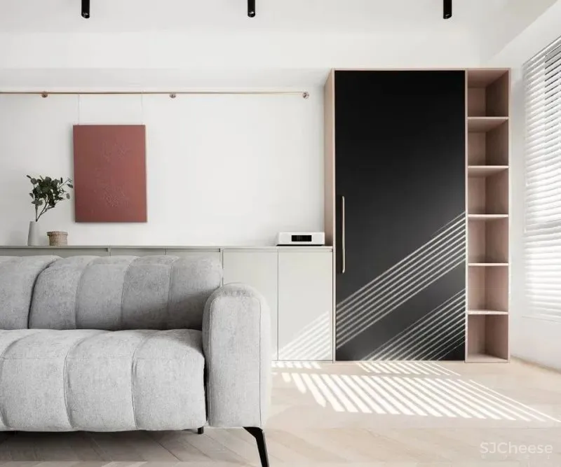在满足观影视距的前提下,沙发尽量靠前布置。释放出的后方空间被打造成家庭画廊。靠窗一侧的立柜是整个家庭画廊的起点,柜内可收纳各类画具。刷黑板漆的柜门变成可信手涂鸦的黑板。