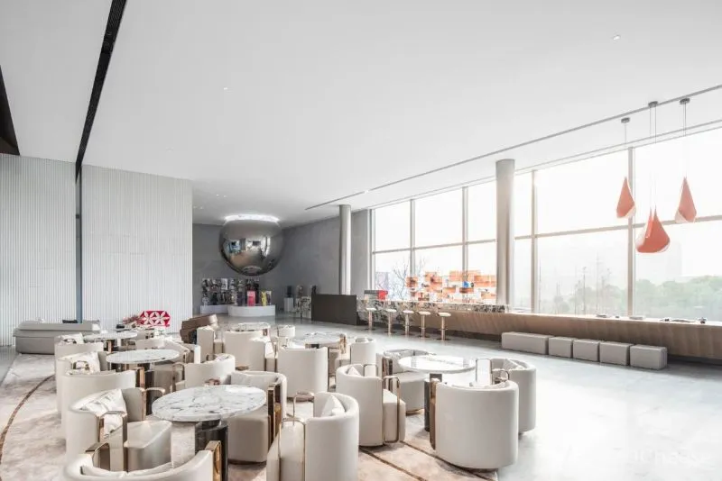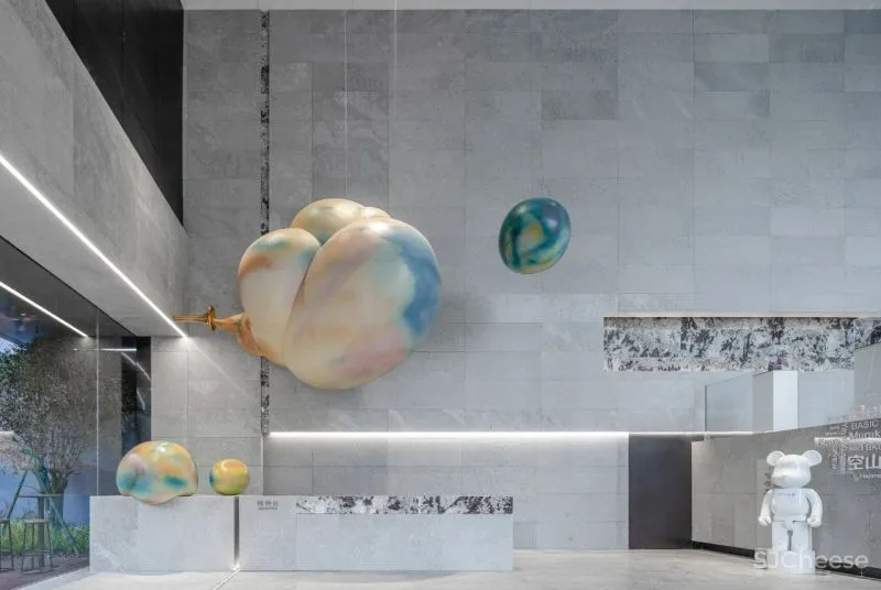 在整个空间的构成形态上,有一些解构主义的特点。以一种非常克制的方式来进行解构。去关注整体形象的平衡、对称和整体感。室内设计将自然引入空间,利用石材构成组合,形成艺术化空间表达。软装结合空间体块,保持简洁的处理手法,体现空间的记忆点与互动性。