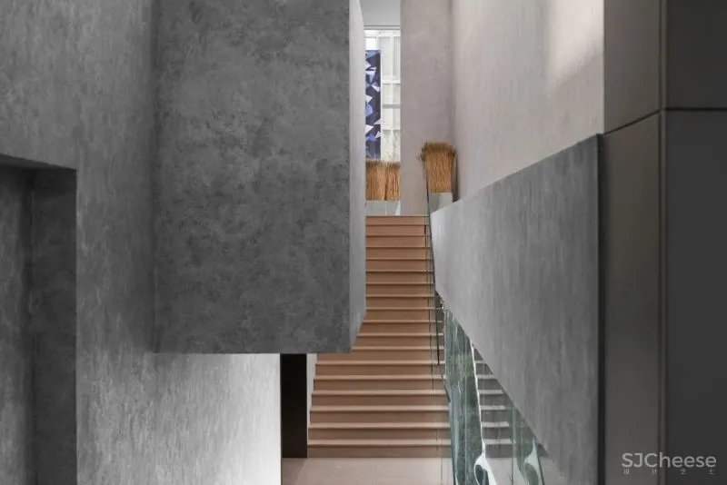 通往一层的楼梯在视觉上起到了一个延展性,简练的线条设计与呼应错落的形体,通过设置垂直共享空间,在墙面开洞及顶面的天光引入,人与空间的交融互动,邂逅最美的诗意。
