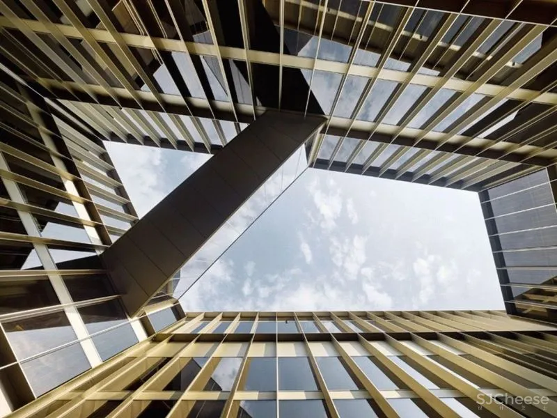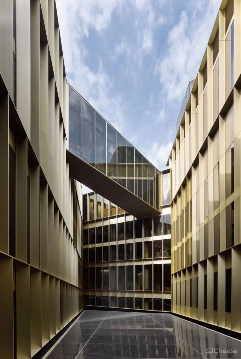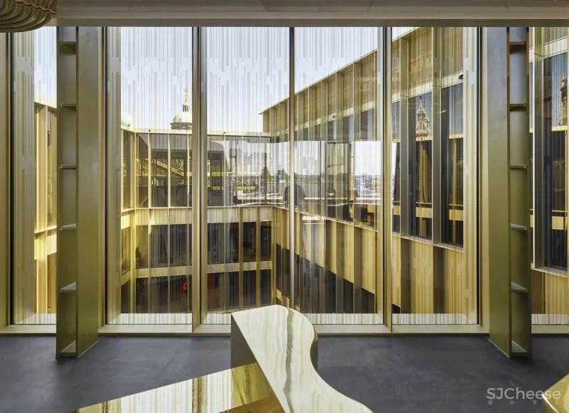 古法制作的有色玻璃和镀金层将外立面全数包裹,赋予了内庭院夸张的视觉冲击力。