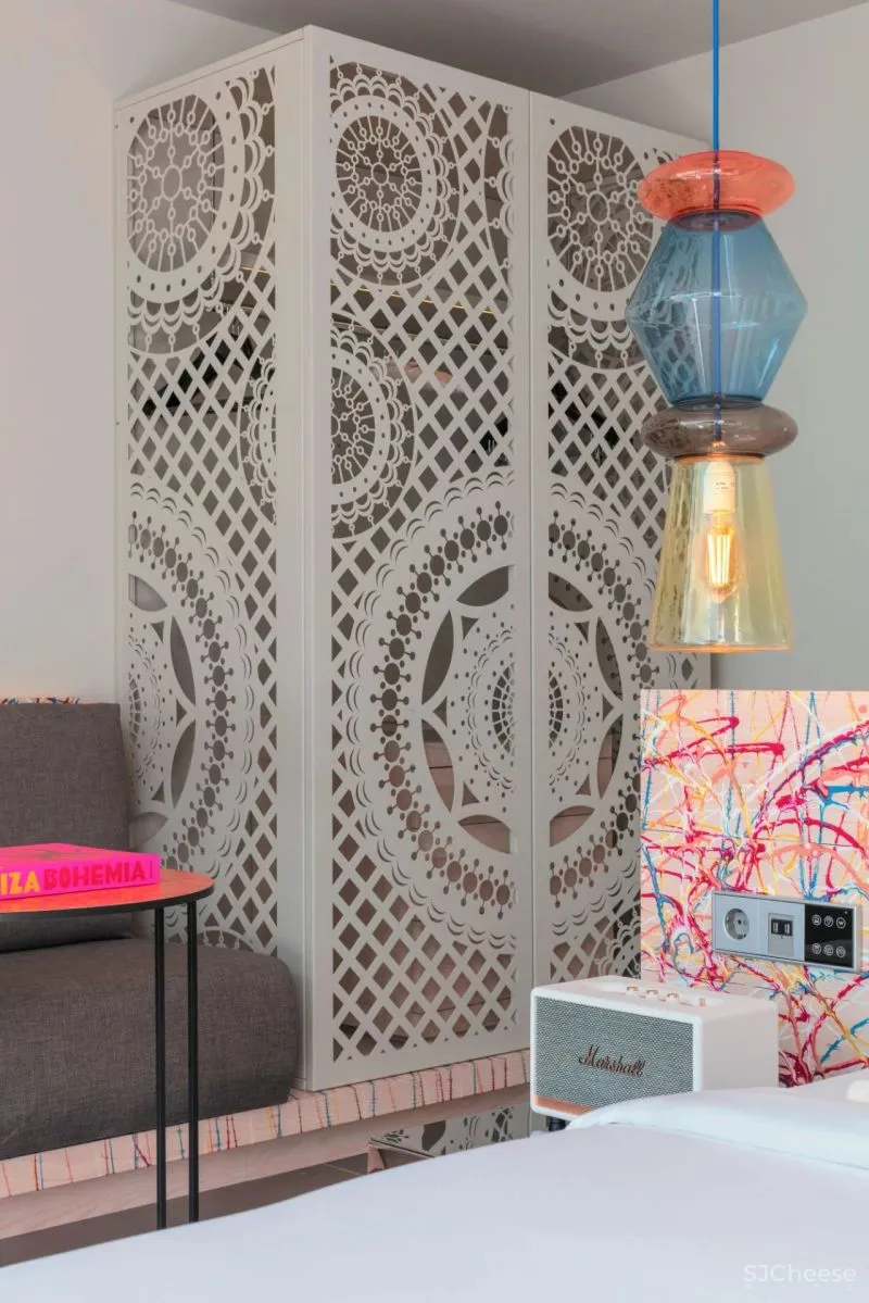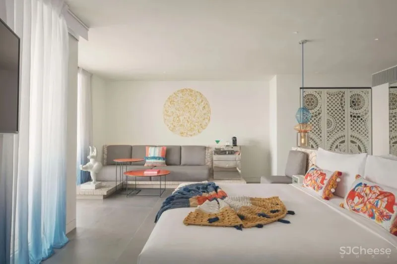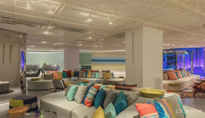 他们将伊比萨岛上的特有的风俗文化与色彩应用在酒店设计中,打破了传统认知中海岛的蓝白色调,将壮阔海景引入酒店,强调公共空间,营造出人与人交流的氛围;同时契合当地文化。