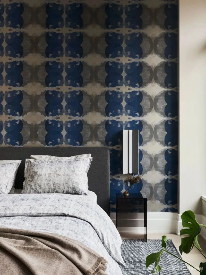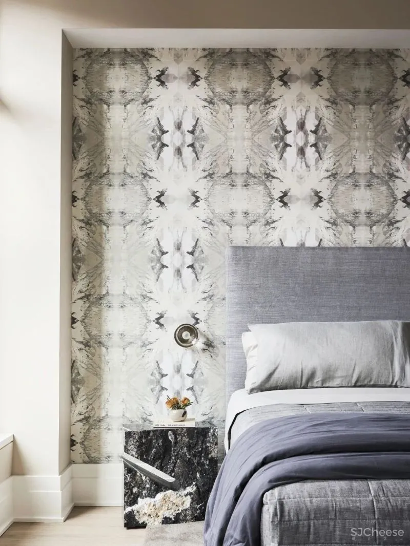 卧室内绿色纹理背景墙成为空间的主导,为空间带来焕然一新的生机与活力。灰色的家具选择,带有些许含蓄的情绪,端庄保守。