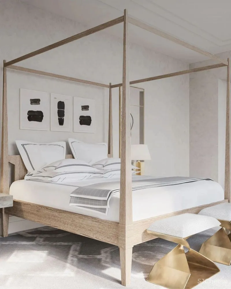 卧室的墙面非常简洁,几幅简单的画作成为这里唯一的装饰,原木的床带来温柔优雅的家具风尚。