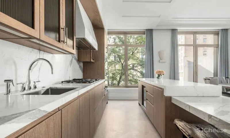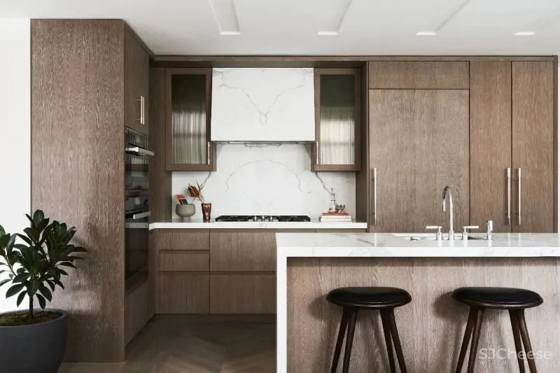 厨房结合木质与奶白色大理石,温馨整洁必然成为这里的标签。木质带来温馨舒适,大理石的台面便于清洁,同时大理石的自然纹理也为这里添加质感。
