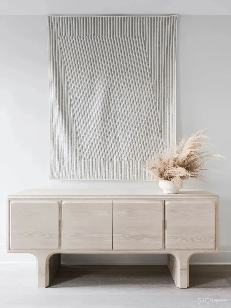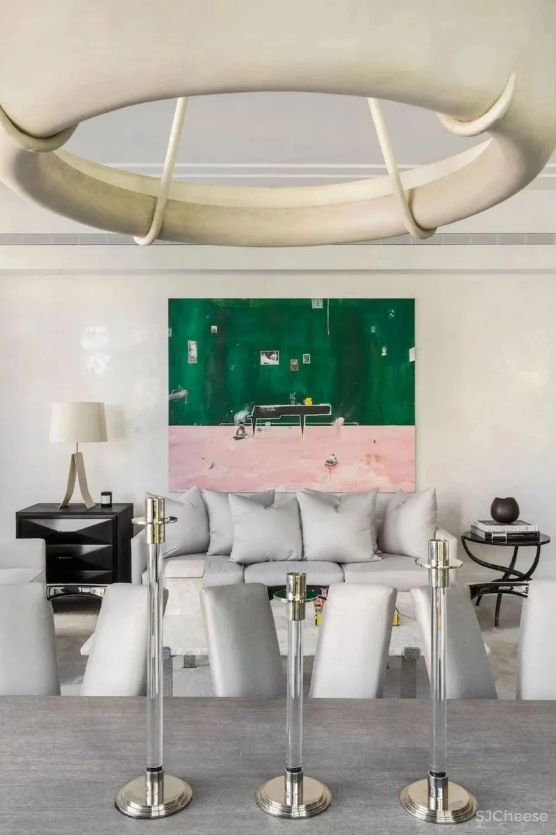 这间公寓有约140平米的大小,2间卧室,2.5间浴室。进门正对一幅艺术装饰,将思绪带入一个全新的空间,顺着长长的走道,步入客厅。