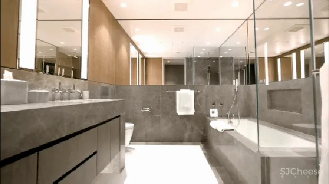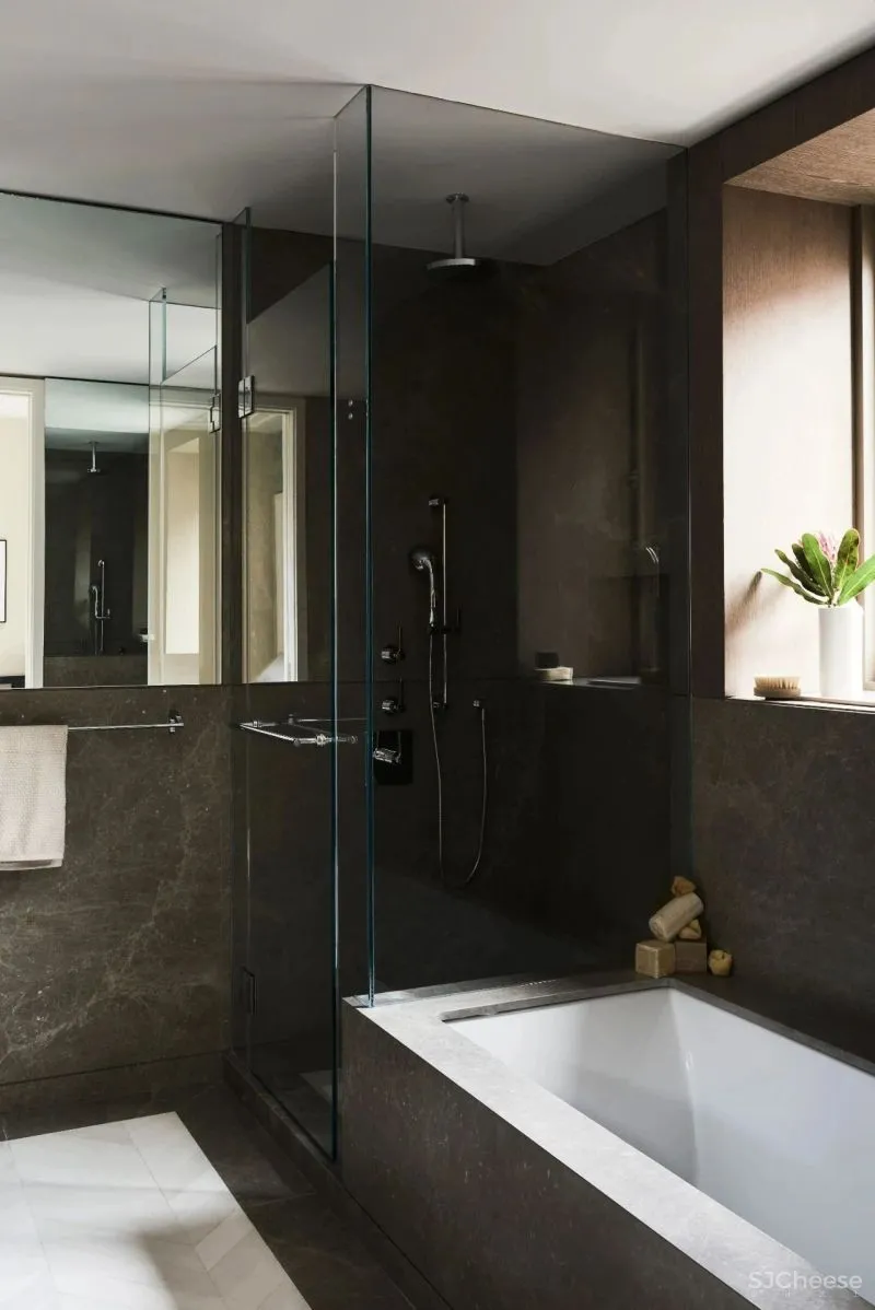 与卧室相通的浴室,也较为宽敞。深灰色的大理石带有些沉稳理性的情绪,四周镜面效果极大的提升了空间视觉上的大小。淋浴、浴缸同时满足主人需求。