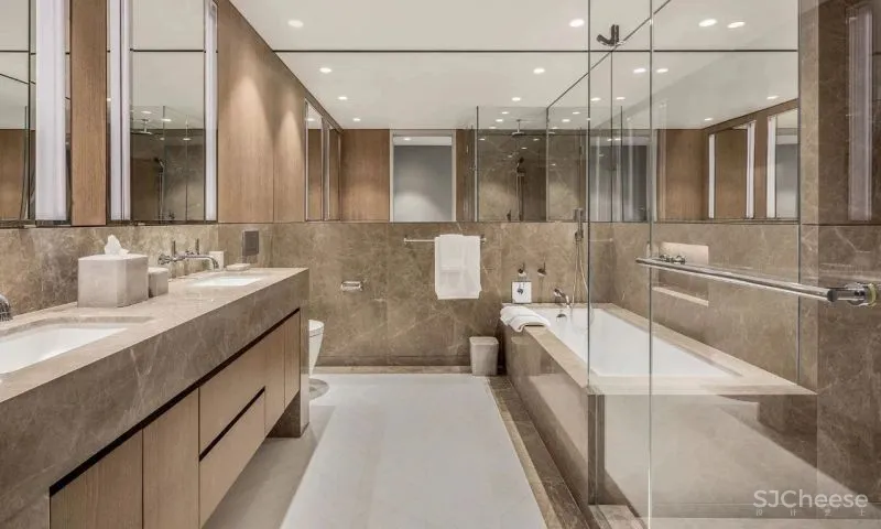 主卧的浴室同样宽敞气派,多个镜面起到扩大面积的效果,深色大理石与焦糖色的木纹增加空间质感。
