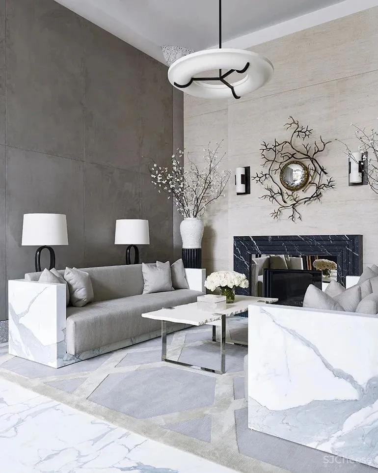 在私密的休息区,两张Korban设计的大理石沙发围绕着一个定制设计的法国石灰石平板咖啡桌,在一个柔软的灰色丝绸地毯上占据中心舞台,全部围绕着一个青铜色的黑色大理石壁炉。