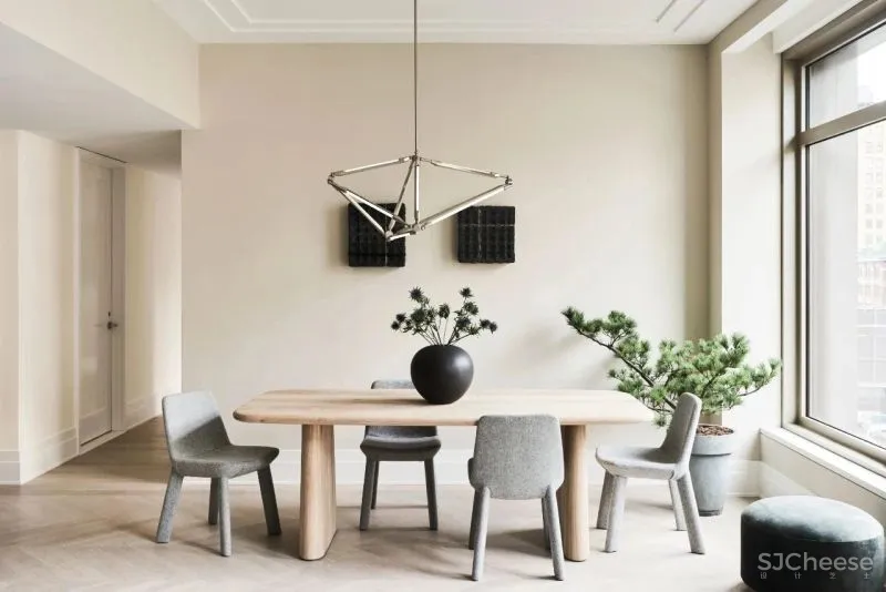 首先是领略80年代川久保玲的东京时尚。从家具以及装饰细节上展示上个世纪东京的时代风情。由几何线条组成的Shy 17的吊灯,引领空间的风格走向。素净的色彩搭配、独特而含蓄的青松,都在渲染东方意境。