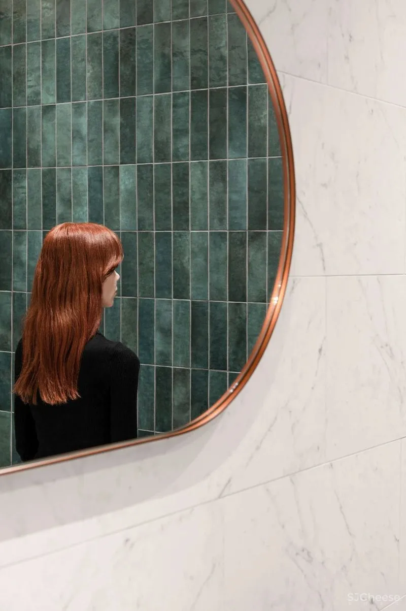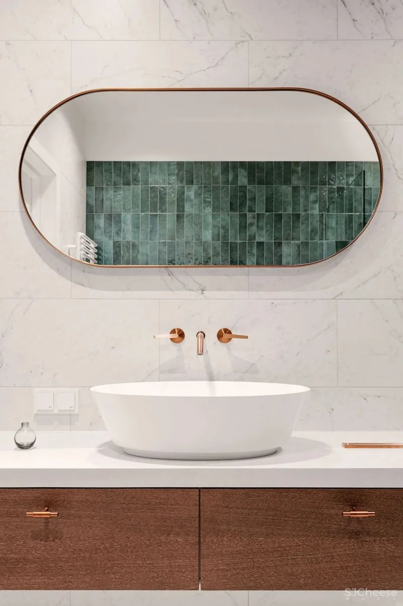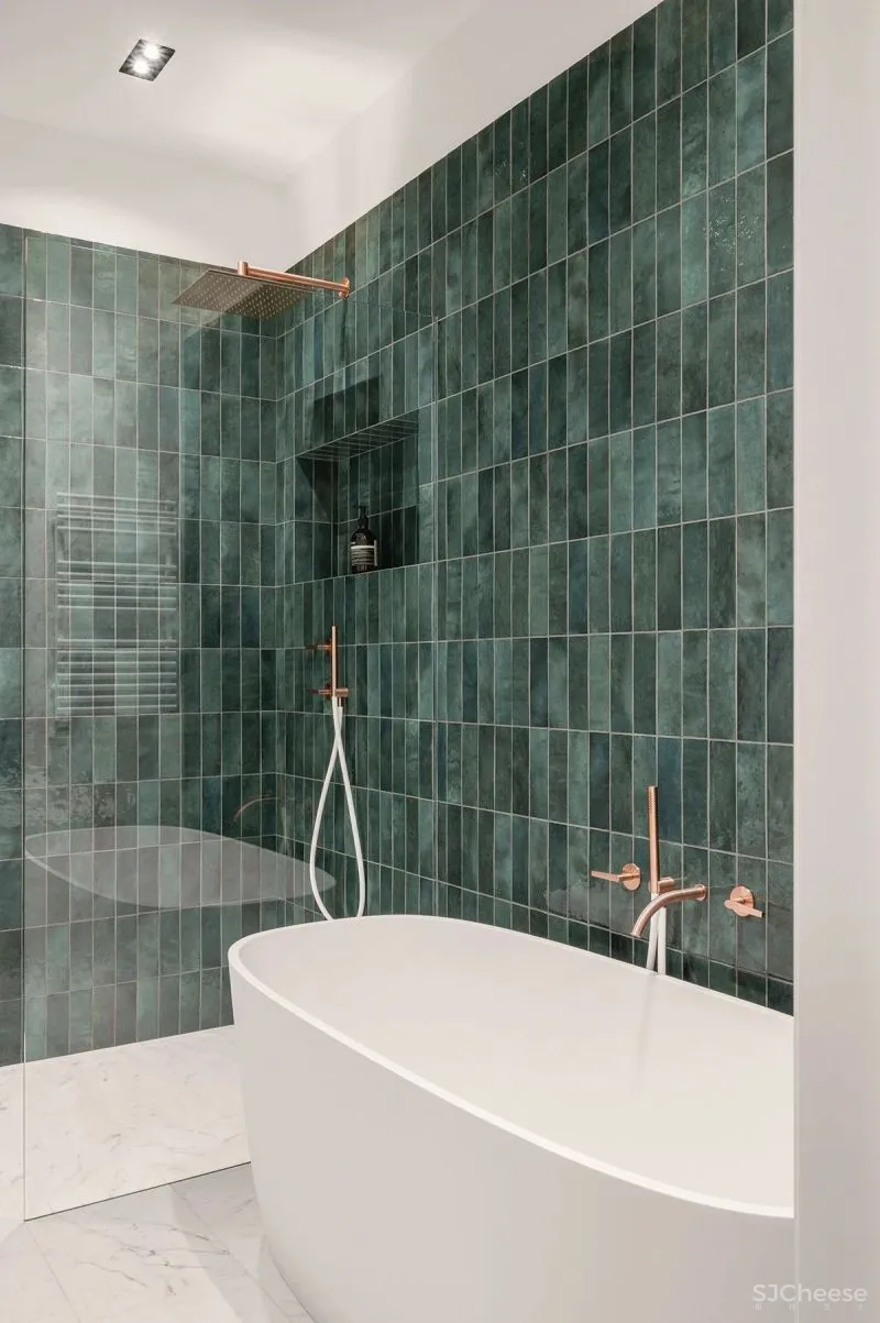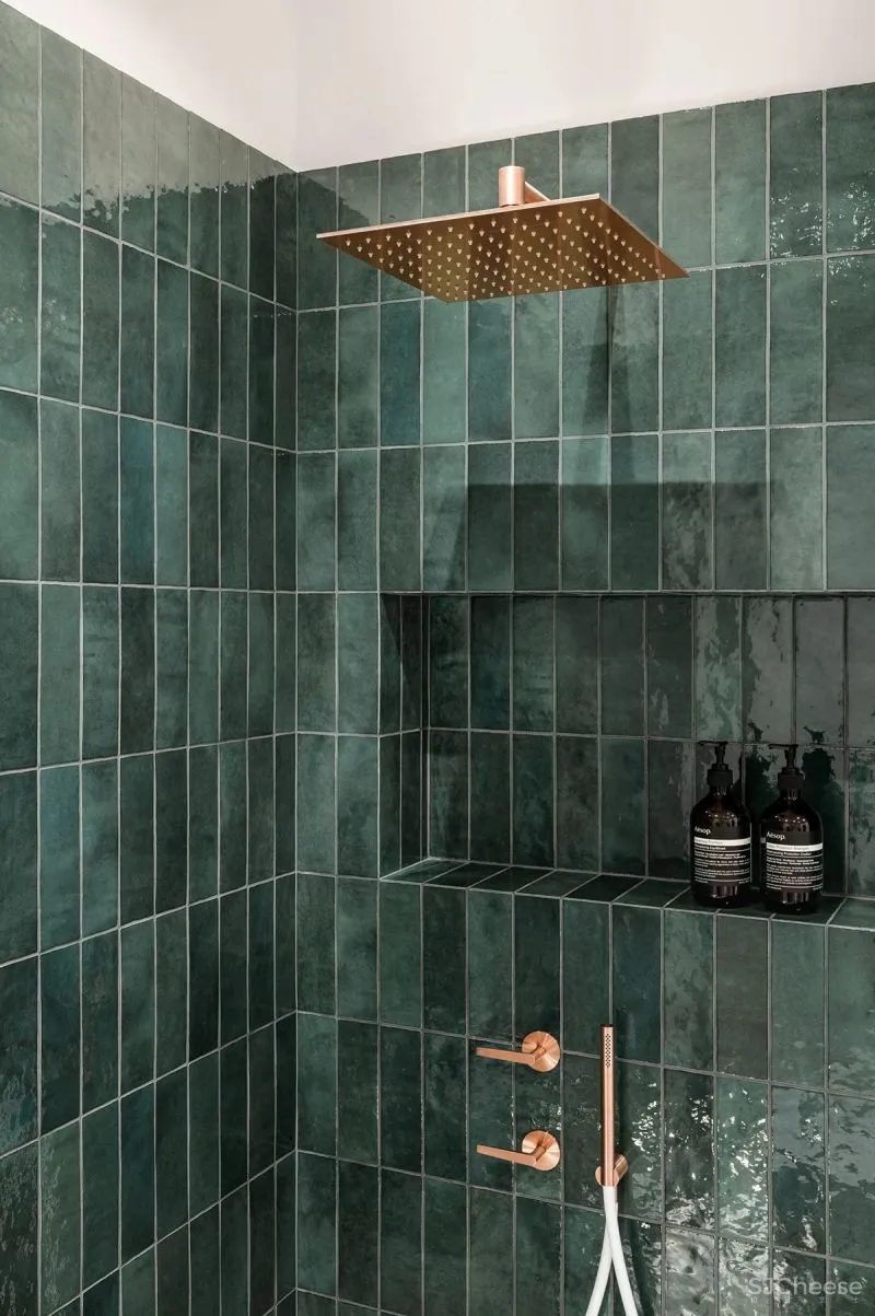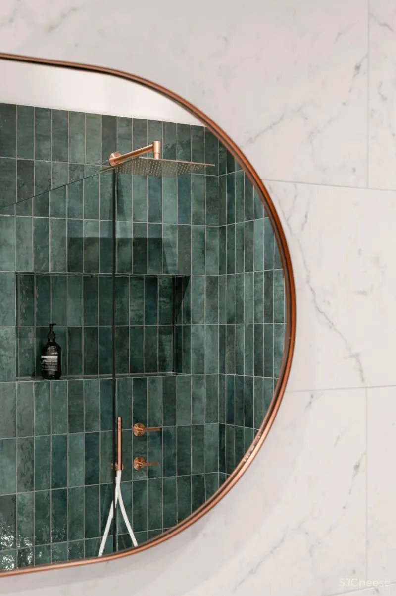 浴室设计师采用墨绿色瓷砖,与白色形成鲜明对比,黄铜点缀,显得非常的温馨典雅,展现出一种复古设计别样的美感。