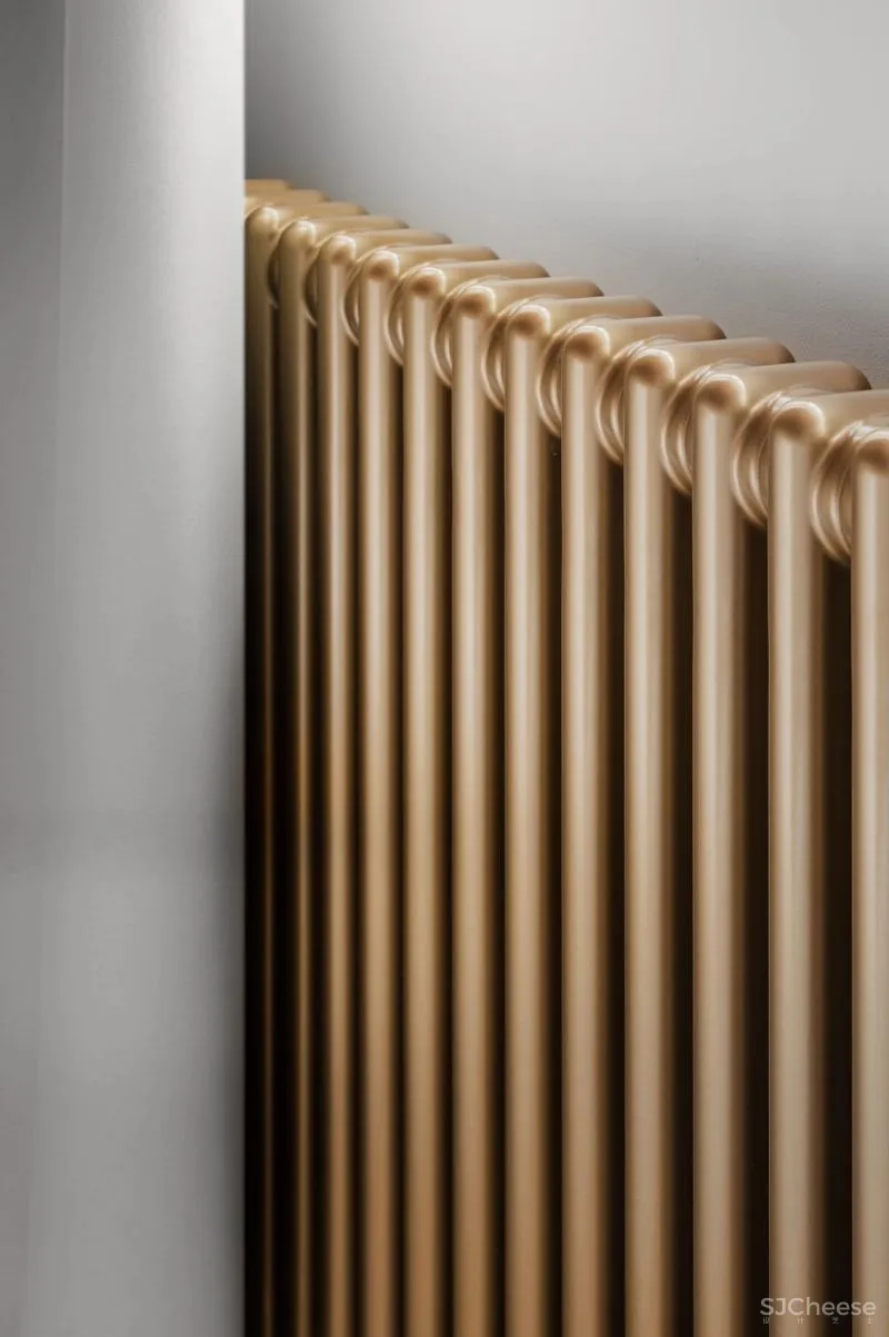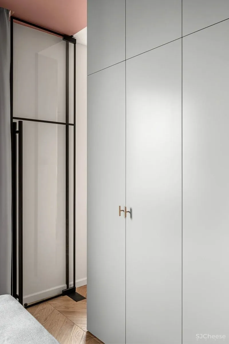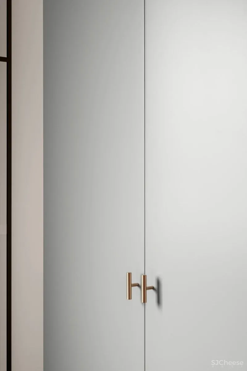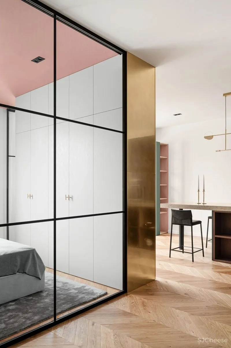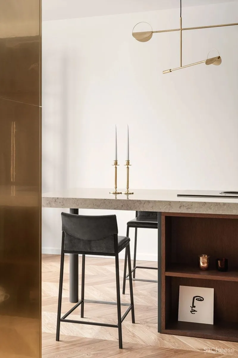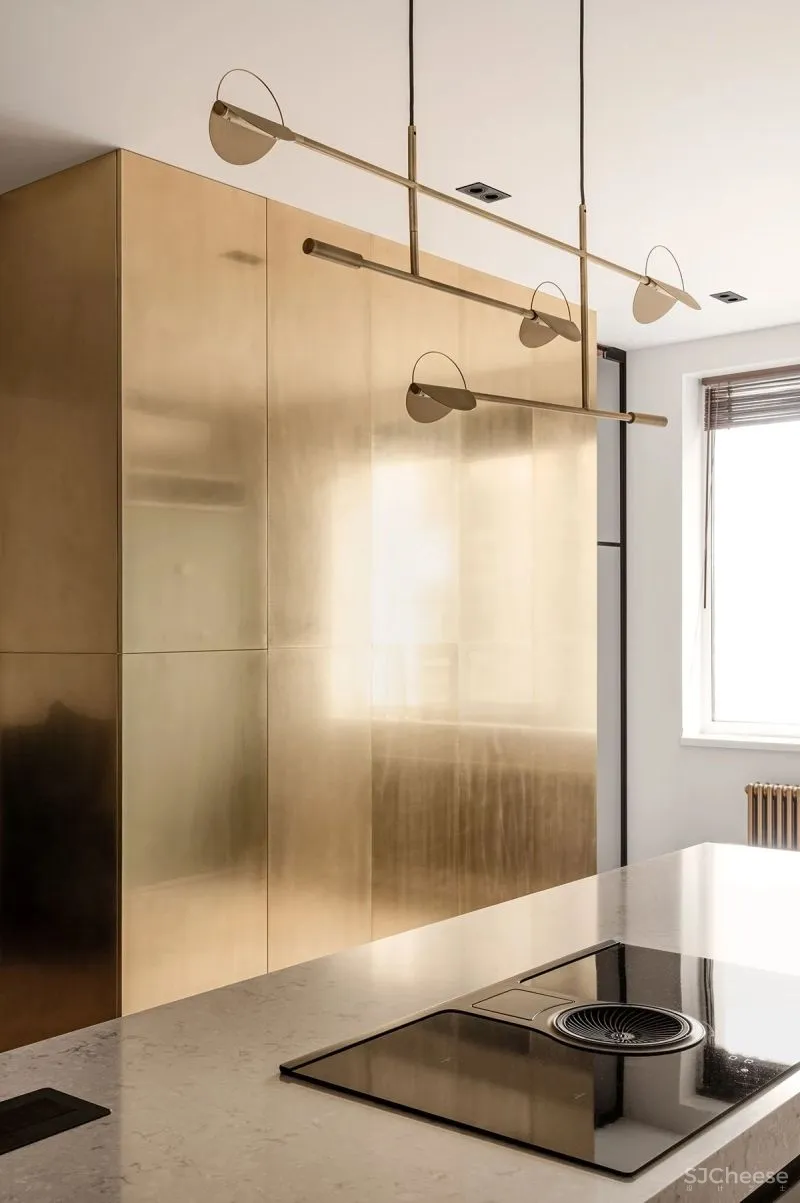 黄铜柜位于公寓的中央,令人印象深刻。厨房岛台下方,尽管空间有限,却被用作储藏柜。
