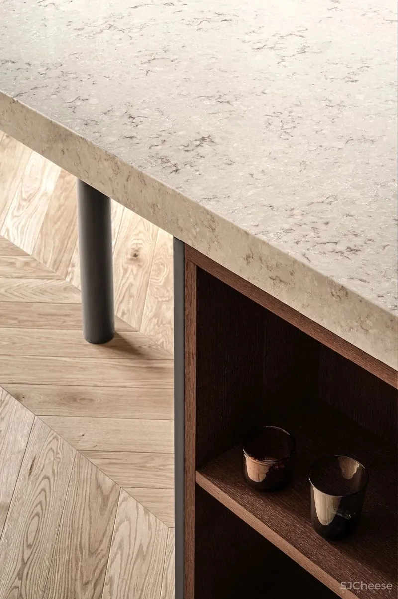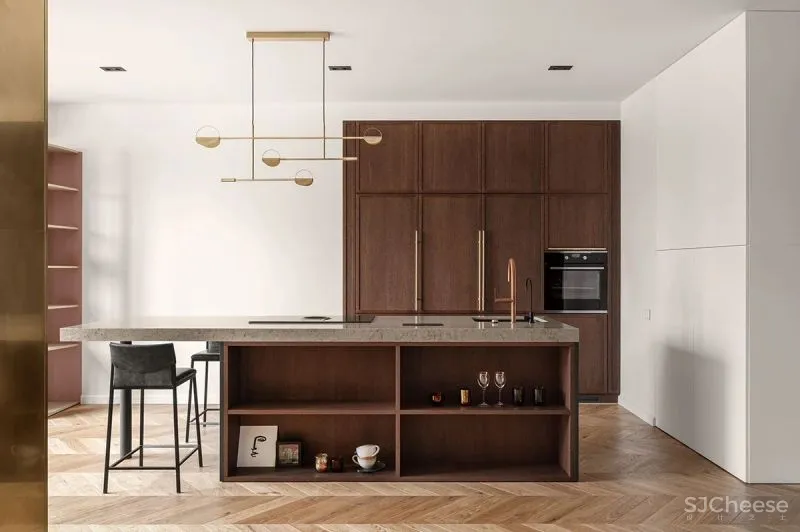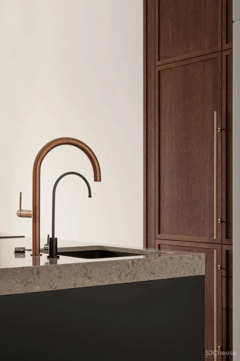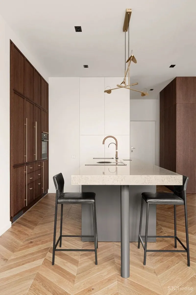 在这个厨房里,岛台上方的Bolia吊灯,增强了空间中的暖色调,简单而又华丽,