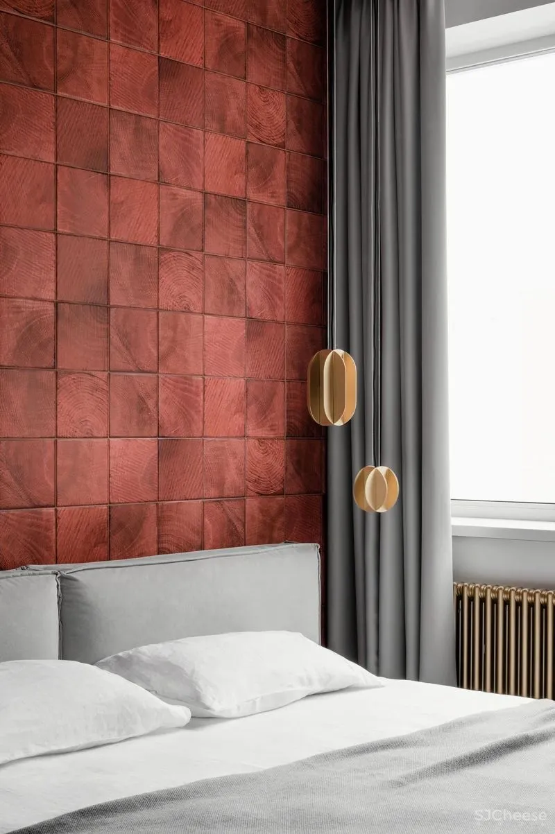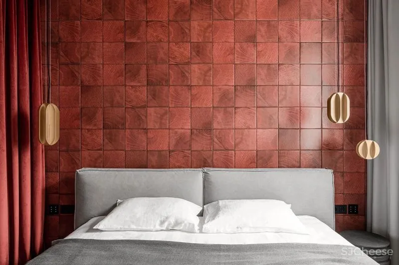 在卧室里设计师采用NOOM品牌吊灯,红色方格的背景。