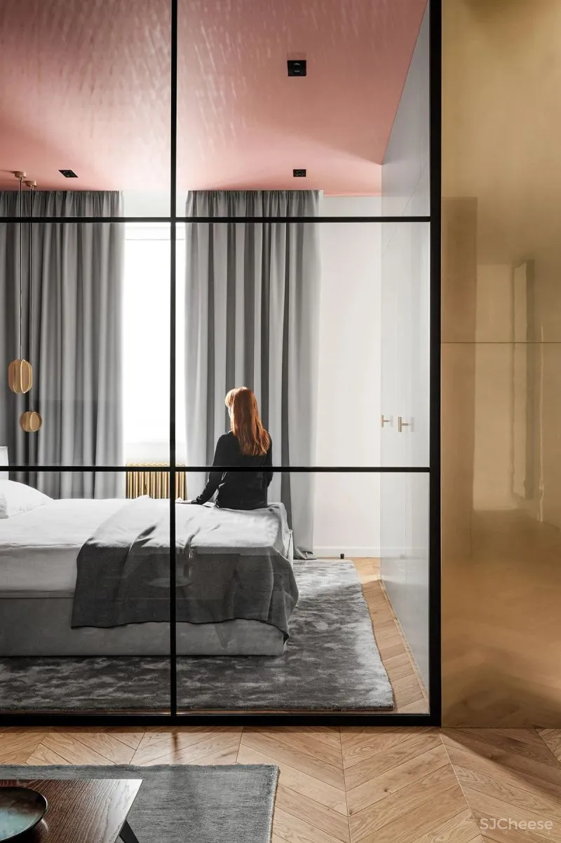 卧室和客厅之间采用明亮的透明玻璃隔开, 透明化的设计将卧室的结构看的一清二楚。