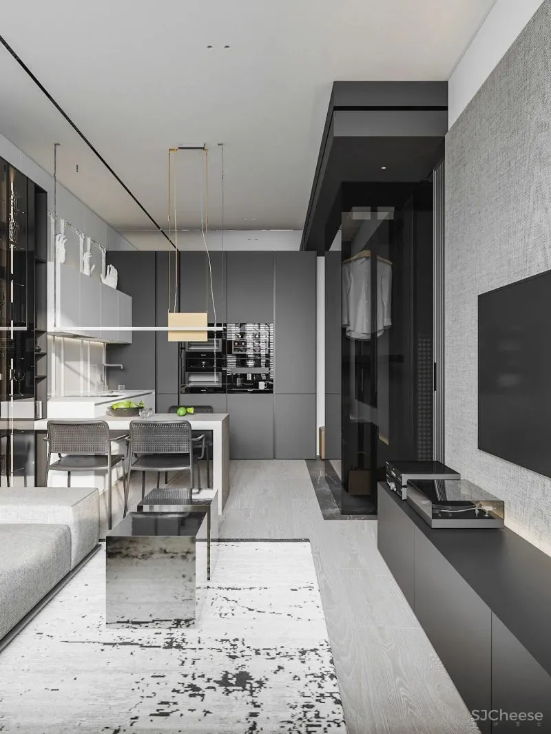 开放式厨房、餐厅、客厅及写字台连成一体 地面也从大理石转变成了木质