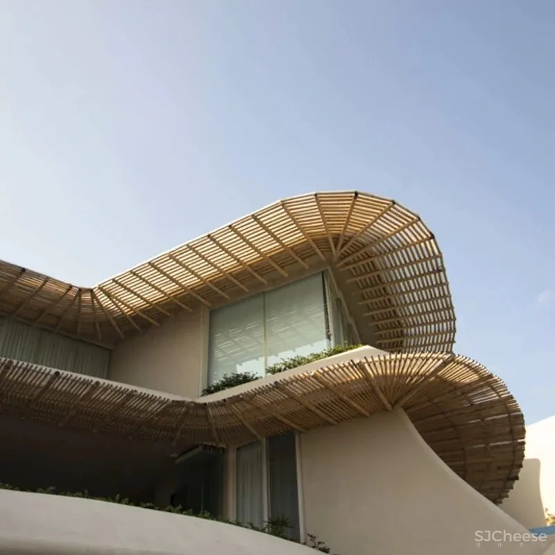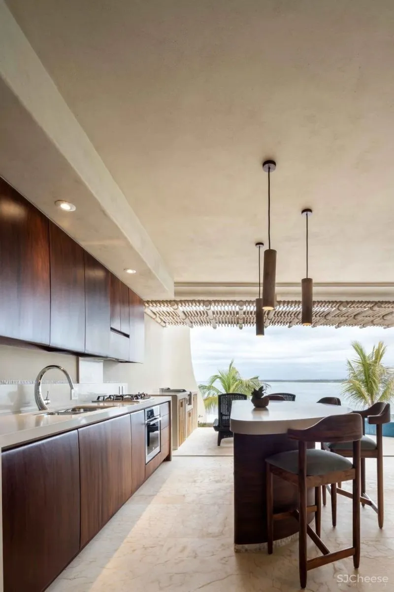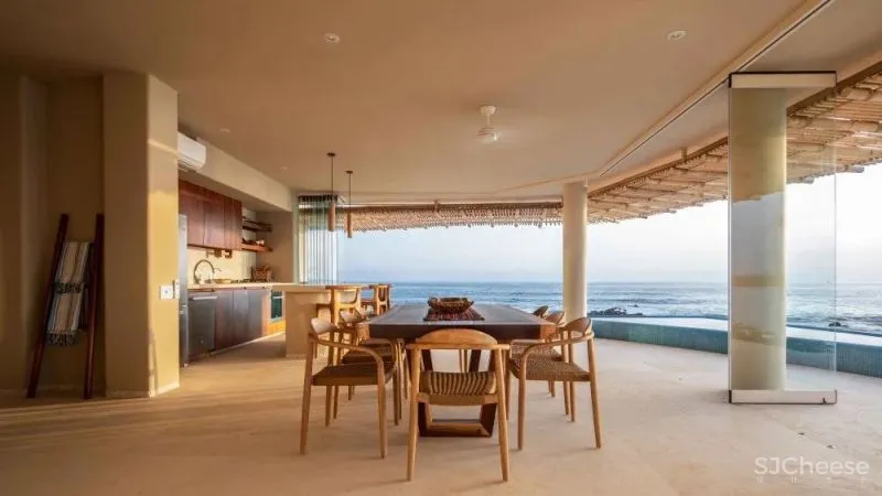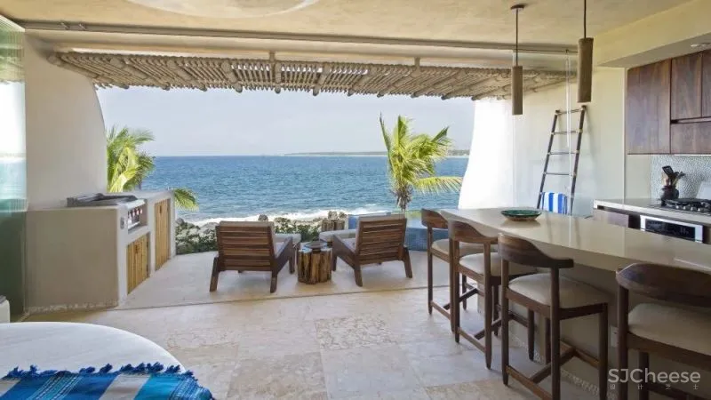 在材料方面,建筑师会选择当地的材料,例如传统的Zihuantanejo沿海风格通常使用的材料,例如砖石墙,竹子,凉亭和帕拉帕斯的干棕榈树枝,装饰石头的地毯和底墙。内饰,灌木丛打磨的大理石地板,parota木和竹木工。