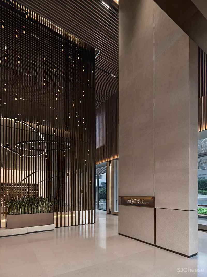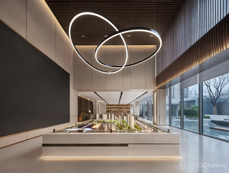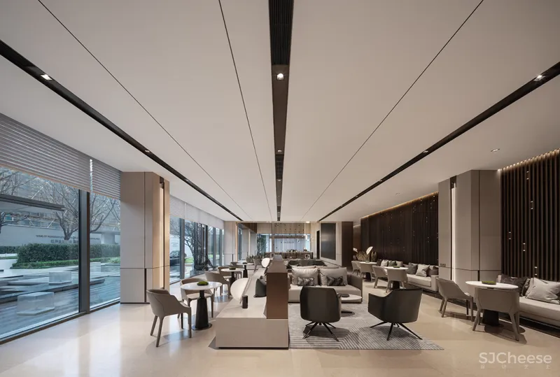 基于对当下人居与未来趋势的洞察,设计师从城市、人文角度出发,追寻格调品味与时代审美的共鸣,强调现代轻奢、简约新潮之感,同时将场域与美学相结合,并统筹室内、建筑及景观院落的和谐共融,以期能给予访客不断的视角转换和空间层次变化的多样体验。