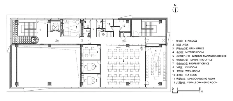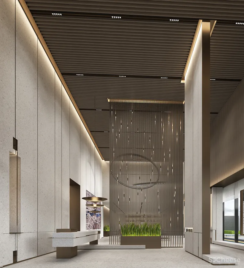 顶面的格栅随挑空顺延至沙盘区,金属条和石材的体块分割,则以强烈的序列感和纵深感,勾勒一种更为宽敞和谐的状态。