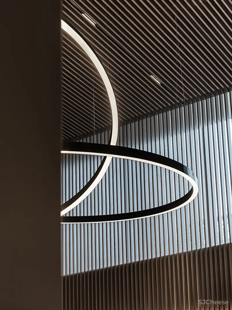 格栅贯穿顶面、立面始终,与植栽槽一体延伸,在打造端景的同时,强调前厅、沙盘区、洽谈区乃至各区域的交流连接,又带来一丝隐隐约约的朦胧之美,分布的星星点点则是外部景观波光粼粼的情景再现,感性与趣味不期而遇。