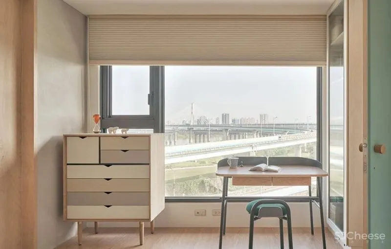一旁的圆形窗有如太空舱般有趣,且具备视觉穿透的安全性,拉下卷帘也能让孩子免于外界干扰,酣然入睡。