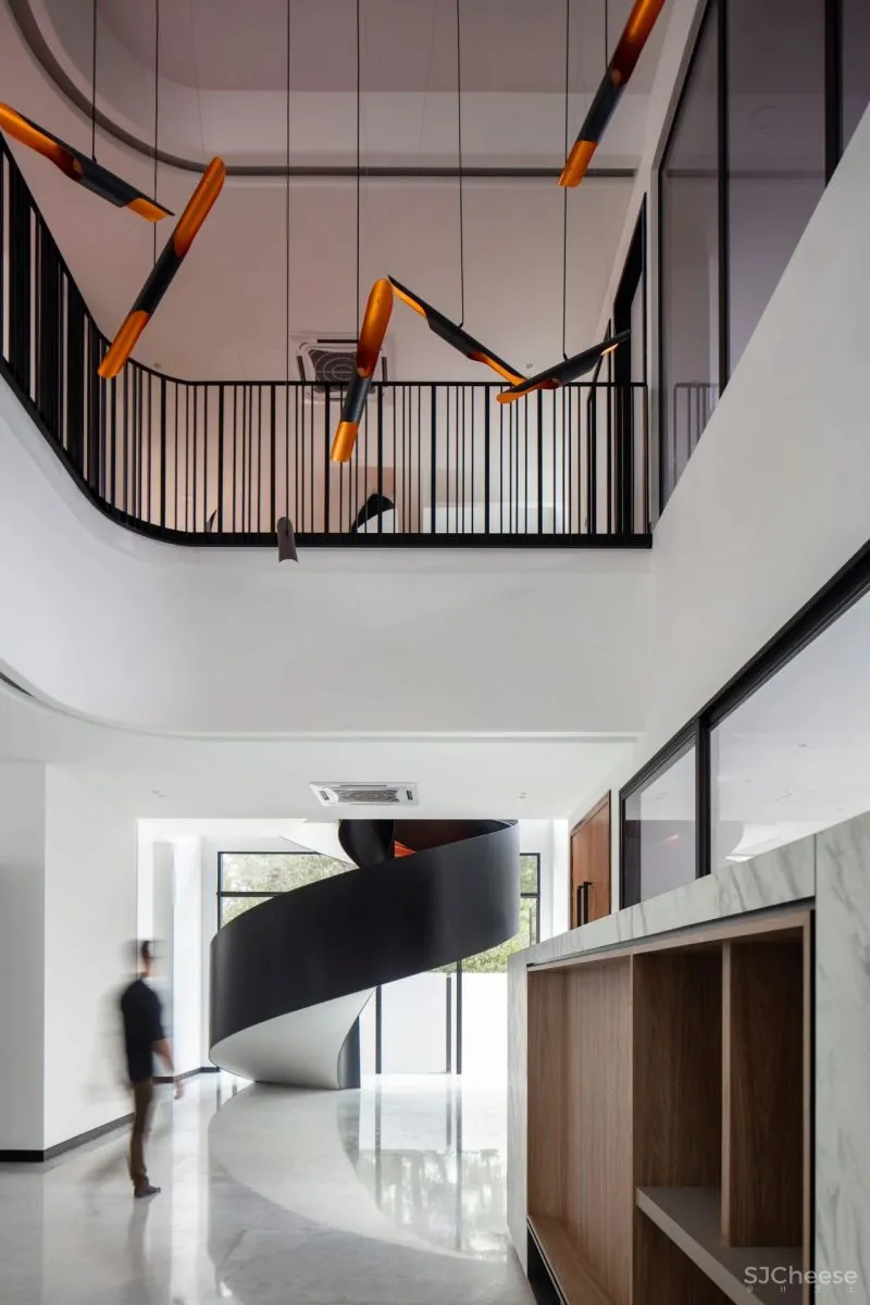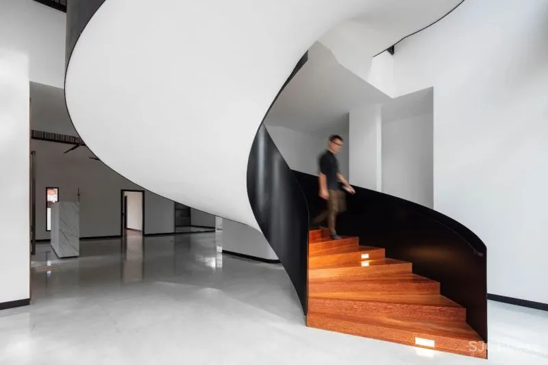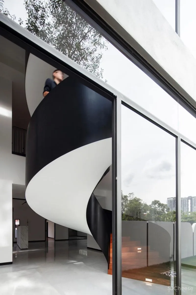 自然光穿过各个楼层进入住宅,从二楼的开放露台和主人休息室到一楼的生活大厅,通过钢化夹层玻璃地板和一层靠近舞厅的空开口。