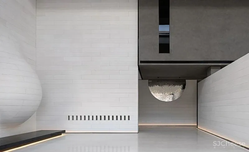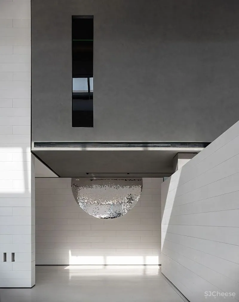 雕塑装置与墙体生长在一起,水波纹半圆装置粼粼闪光,在平滑中过渡出的线条与弧度,成为空间艺术气质的重要构成,与纯白的基调相融相协。立体与平面的结构层次,曲直相衬,伴随光影的挪移,予人一种空灵中有变化、无形中有万象的视觉感受。