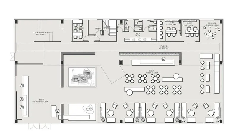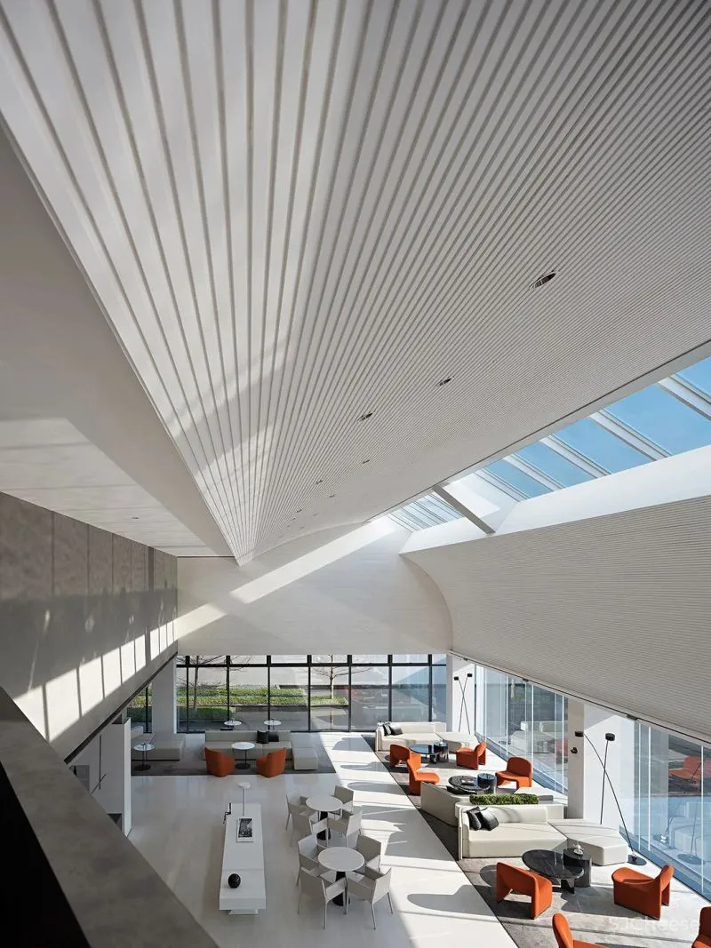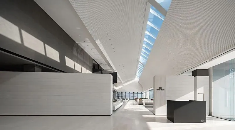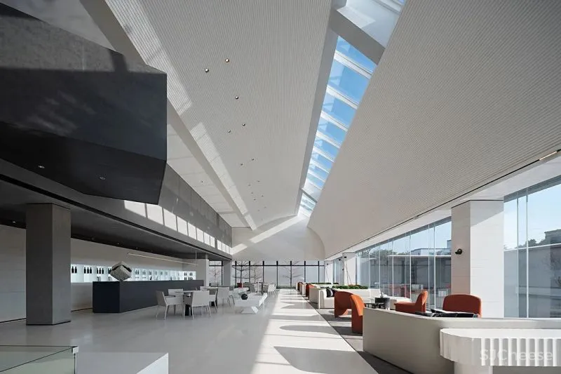 在设计师看来,解构空间不限于重组块面、线条的技法,更重要的是自然、艺术、生活的巧妙融入。在中空挑高的洽谈区,设计师将线条交织于弧面,同时在弧面与弧面之间,引入一排透明天窗,以玻璃材质构建光的入口,令虚与实、刚与柔、轻与重的对比呈演出艺术化的效果。