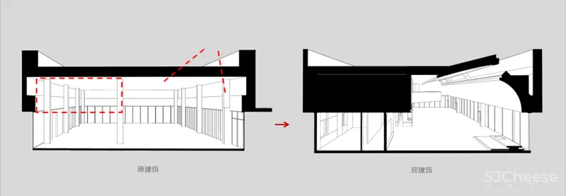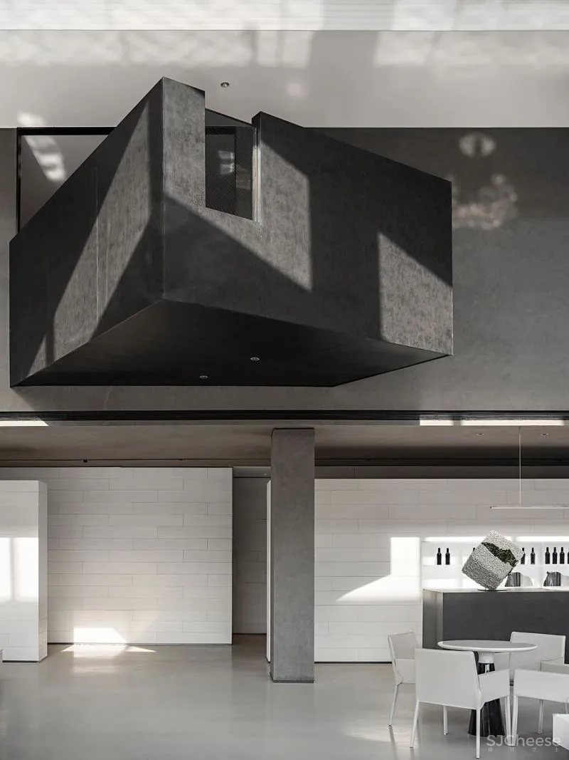 设计师在原建筑的基础上,增加了阻隔视线的微型体块,譬如旁逸斜出的檐挑结构,令空间整体布局看似一览无余,实则注入了一抹有所保留的神秘感。