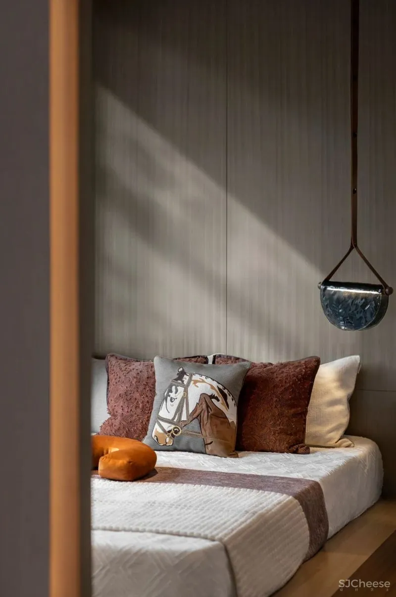 在家人们独自的卧室空间中,我们针对不同成员的使用习惯,进行空间元素、材质与色彩的调配。长辈房利用飘窗结构,设置了一个可以放置物品的壁龛,整体色调以浅色素雅为主,营造静谧平和的空间基调。