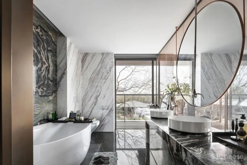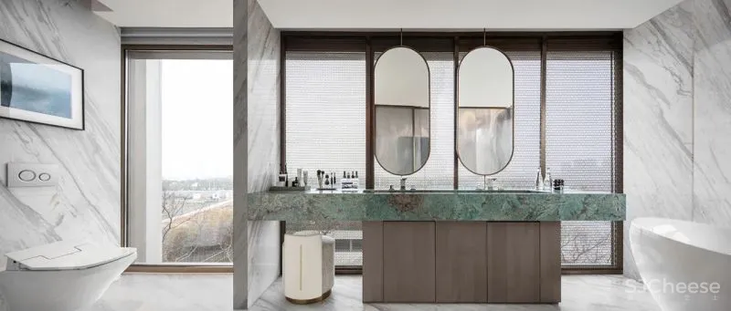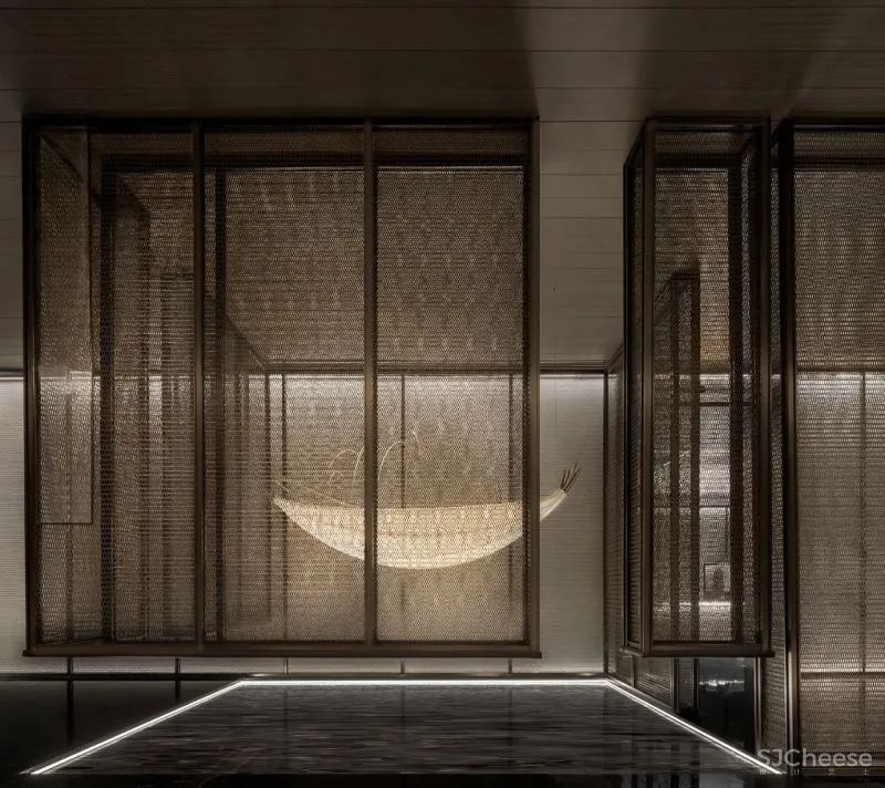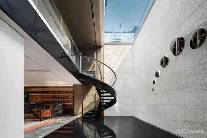 The reception room on the second floor is built as a social space for the male host, with exquisite bar and professional wine cellar for private enjoyment. It is an exclusive place for chatting and chatting with friends. Sunlight is reflected on the etched texture of the inner wall of the space by swaying waves through the swimming pool, forming an attractive staggered light and shadow. The art installation Friends of Time on the wall of the courtyard, under the sunlight, the metal material is refracted like a prism, silently recording the flow of time.