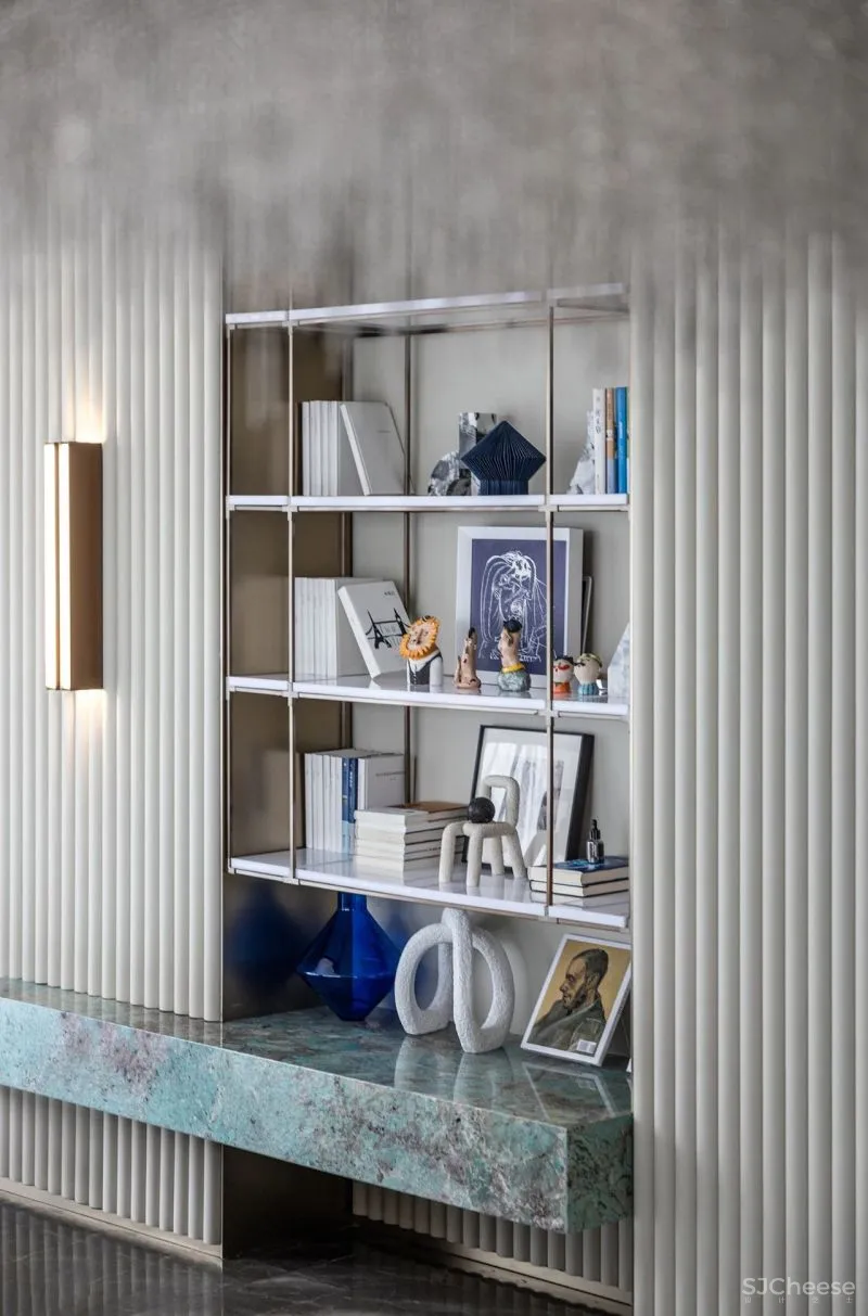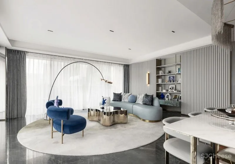 The light gray tone is laid out, and the blue color and delicate metal are used to create a soothing and artistic living atmosphere in the space, and form the visual and feeling rhythm of the whole space.