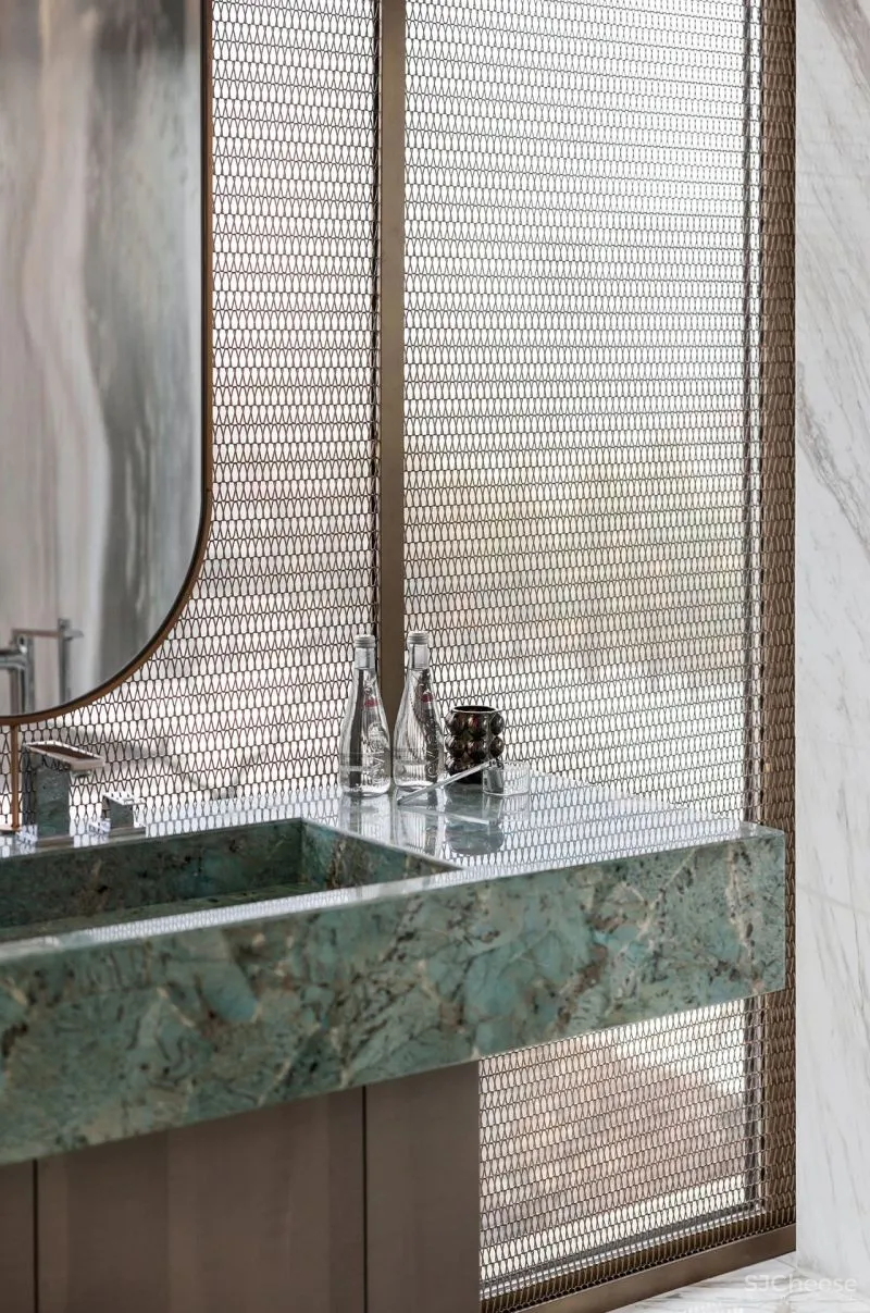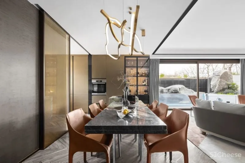 The multi-functional family room can meet various life scenes such as parties, movie-watching and salons. The natural transparent background of luxury stone and mirror water-grain stainless steel turn into a shining light source to shine in the space, adding a more shining atmosphere for the party.