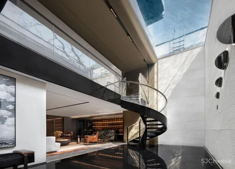 入户采用了内外双玄关的设计,外玄关连通车库,内玄关则通过一个双层挑高的“内庭院”的打造,进入到与顶部全透明泳池天窗相连的开放式会客厅。