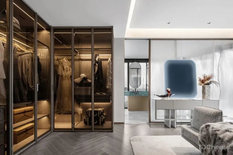 The master bedroom is equipped with a fully functional and spacious custom-made cloakroom and a separate bathroom. Light blue bed with a sense of wrapping, comfortable and warm, unique selection into the master bedroom visual highlights, showing the taste of the hosts fashionable atmosphere.