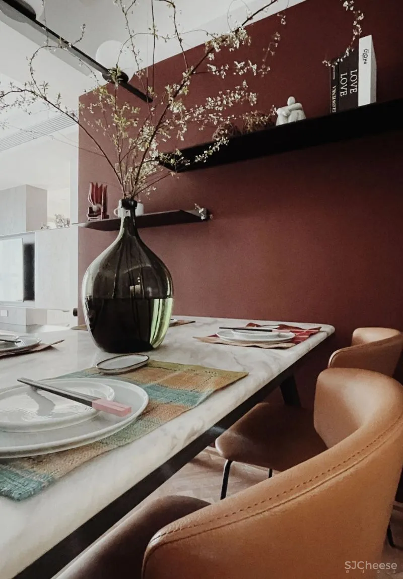 一面朱红墙打破公共空间单一色彩,橄榄绿的竖条墙砖编辑空间纹理,让空间有了更加丰富多元的表达。