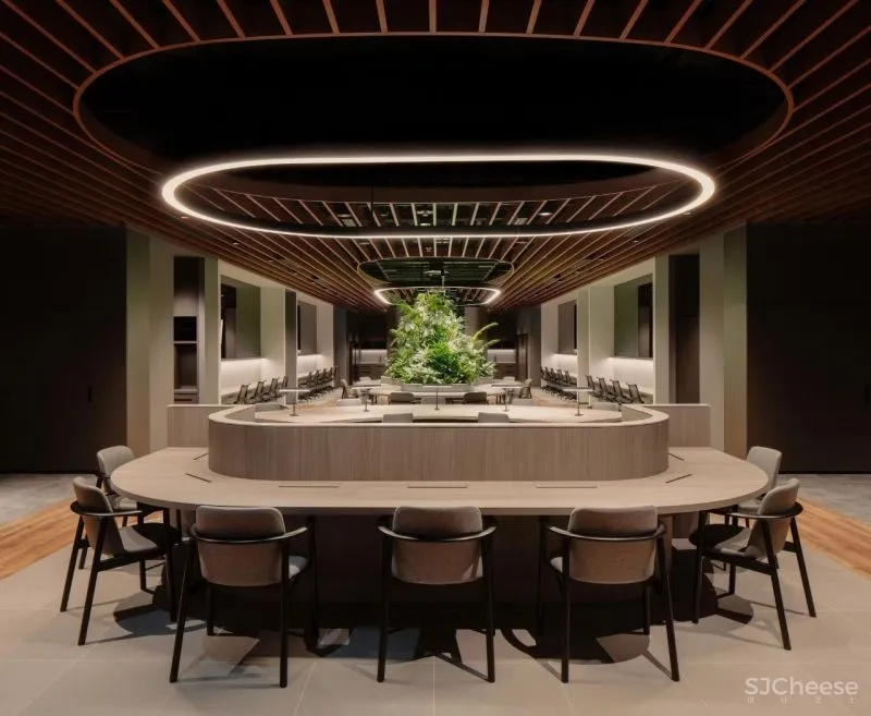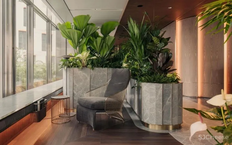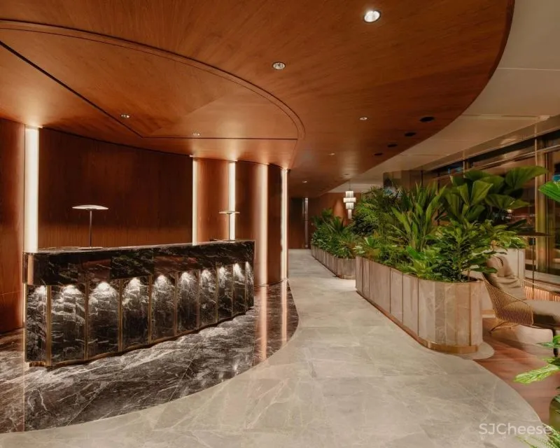 一系列精心布置的培植盆、沿着墙面曲线蜿蜒向前,曲折的通道和会议空间藏身其中。大量金属装饰着培植盆的边角,搭配实木地板和大理石地砖,渲染出金色的豪华质感。