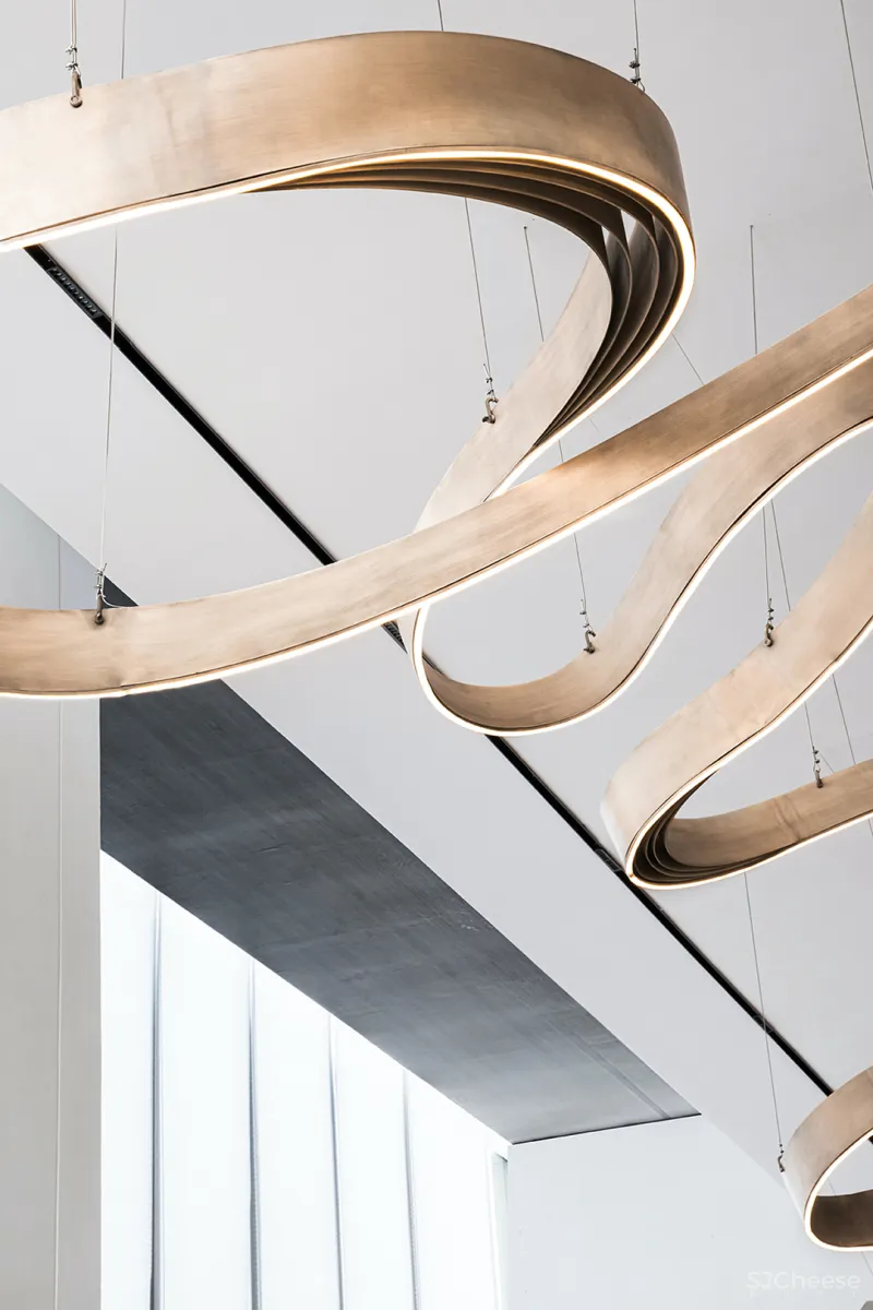 在展陈营销类项目中,动线是推敲设计的重要线索。本案中,“线性动线 竖向空间”的组合,不但规避了原始场地的限制,且调动原有空间的资源,如柱子等,组织出全新的、生动的整体空间关系及品质属性。空间处于整体关系中,局部空间不是孤立存在的,合理稳健的动线设计,是优化空间资源且将其整体化的核心方式。