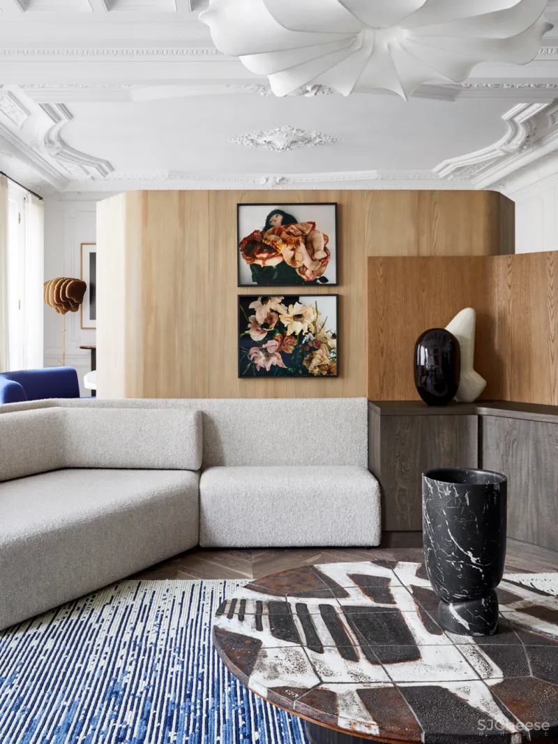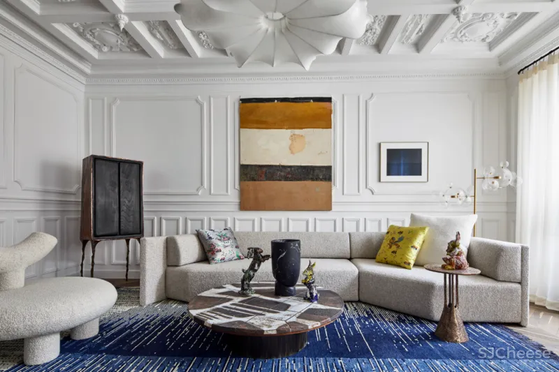 客厅中,用白色作为空间中的主要配色,天花板上的色彩统一,精致而高级的浮雕为空间增添了艺术性,浅灰色的布艺沙发搭配宝蓝色毛绒地毯,大胆的配色十分吸睛。沙发后方的黄色挂画与地毯形成了颜色上的对比。定制的书架摆放与客厅左边,用于分隔空间。