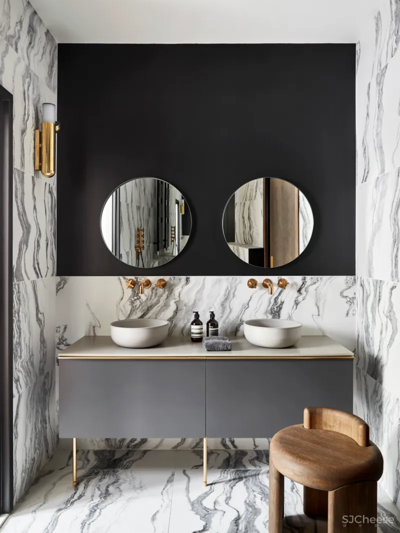 卫生间中使用了大面积的白色大理石花纹,营造了干净纯粹的空间氛围,洗手台与镜面对称式的设计,也为空间带来了别样的几何美感。