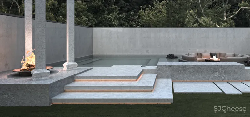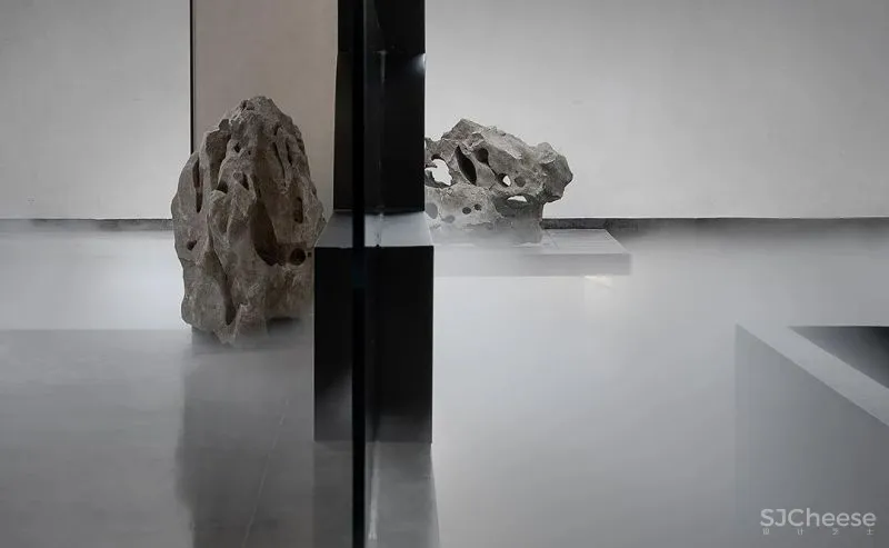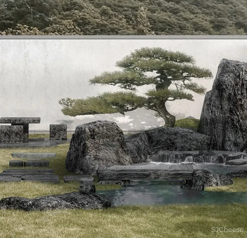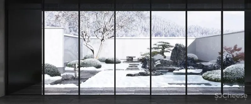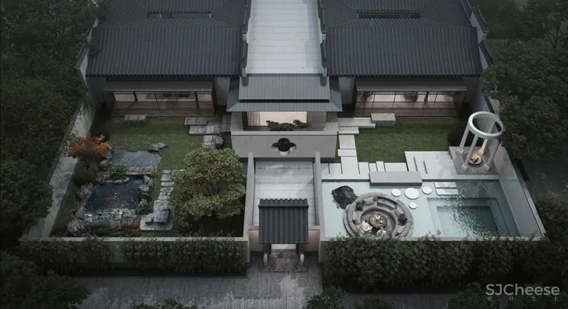 设计以自然山水、以及孕育的文化底蕴为基调,结合建筑空间布局,通过全围半围等关系来营造入口及庭院空间。通过场地内外山水互动,于大美山水中感受时刻动静变幻的庭院风光,打造专属心间的一面湖水,反映主人特有的隐雅风情。