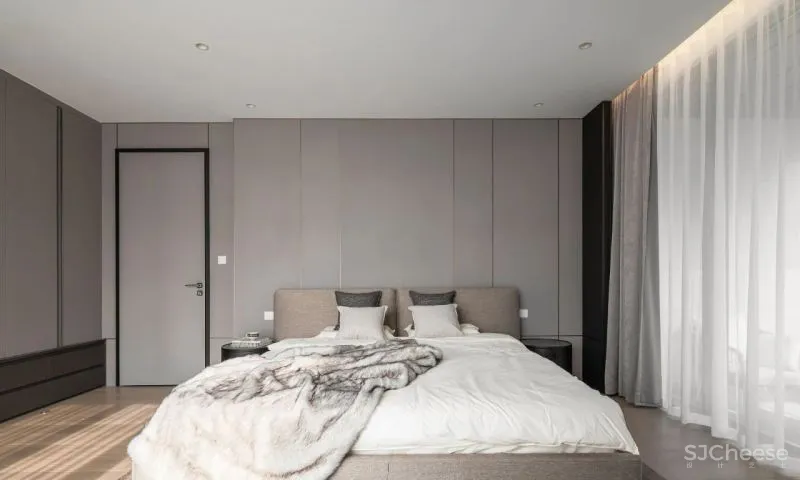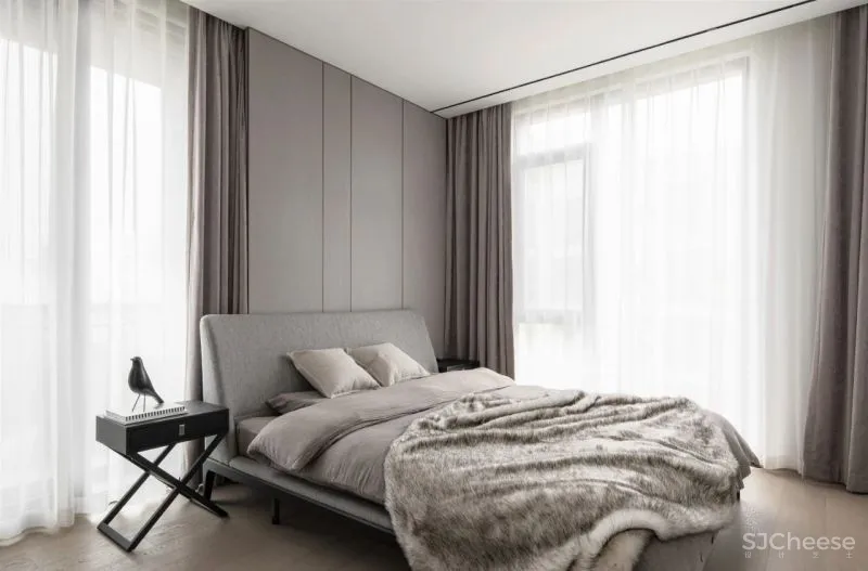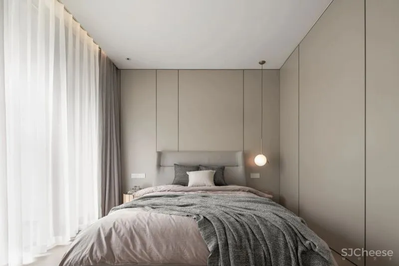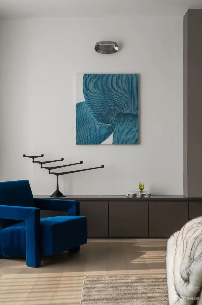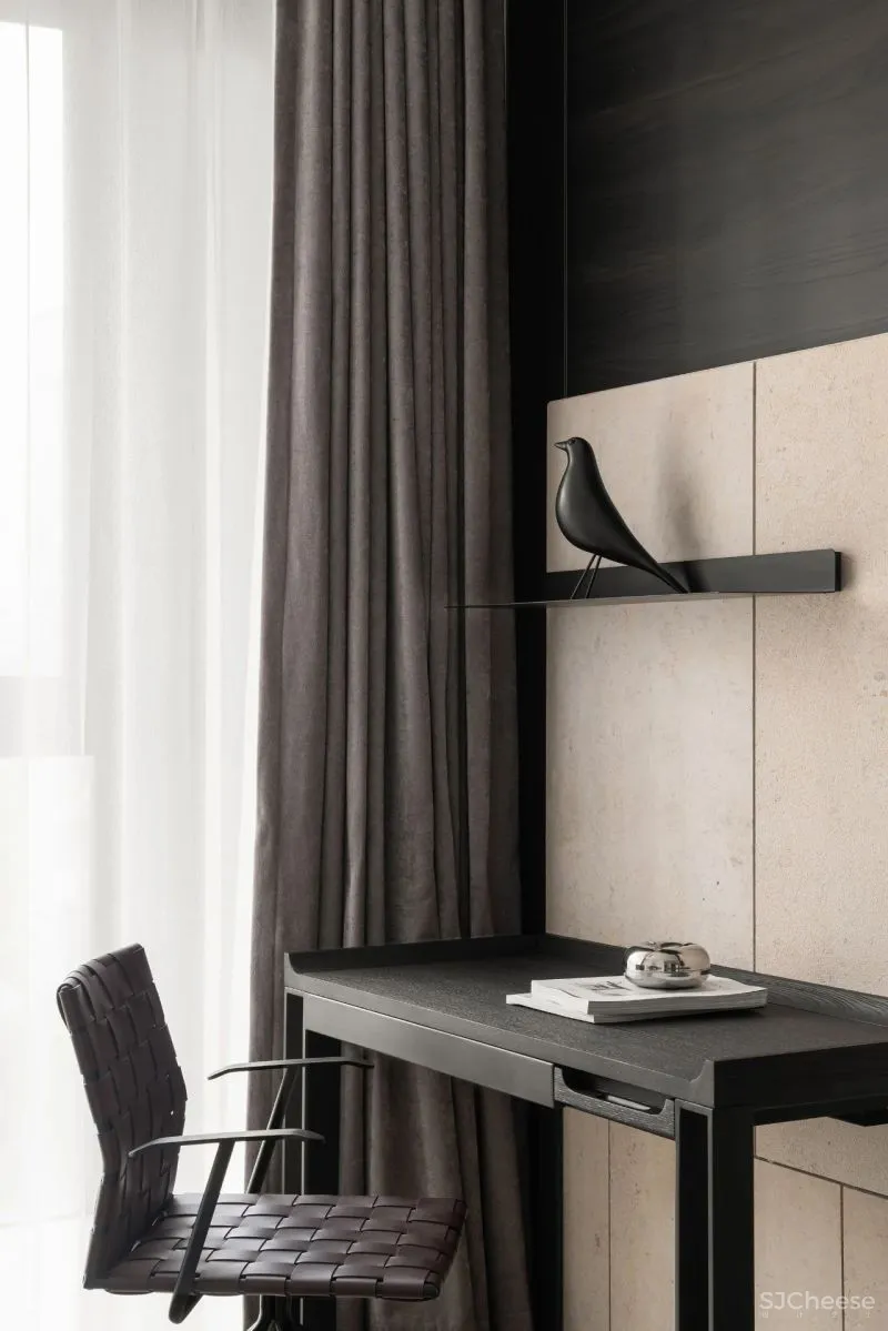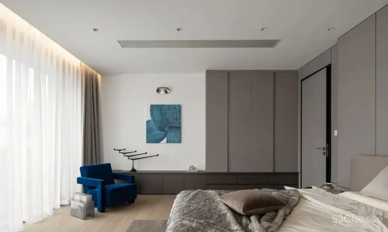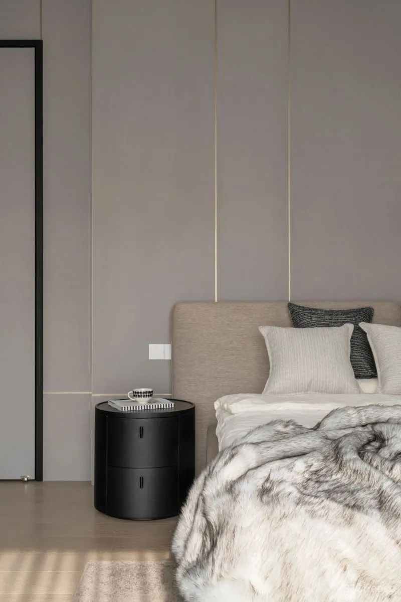 书房作为半公共空间,整体材质与客餐厅保持一致。而卧室选用更加柔和的布纹护墙,软装以蓝色装点,增加静谧的色彩情绪。