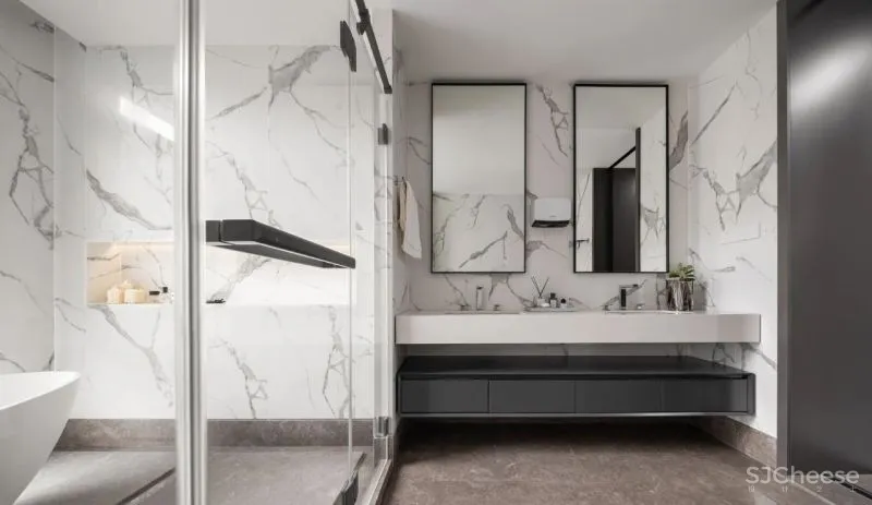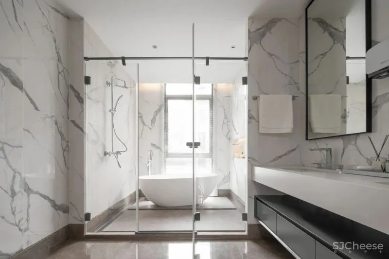 卫生间强调干湿分区,淋浴区石材经过酸洗处理,增加地面防滑效果,同时四周设有排水槽。