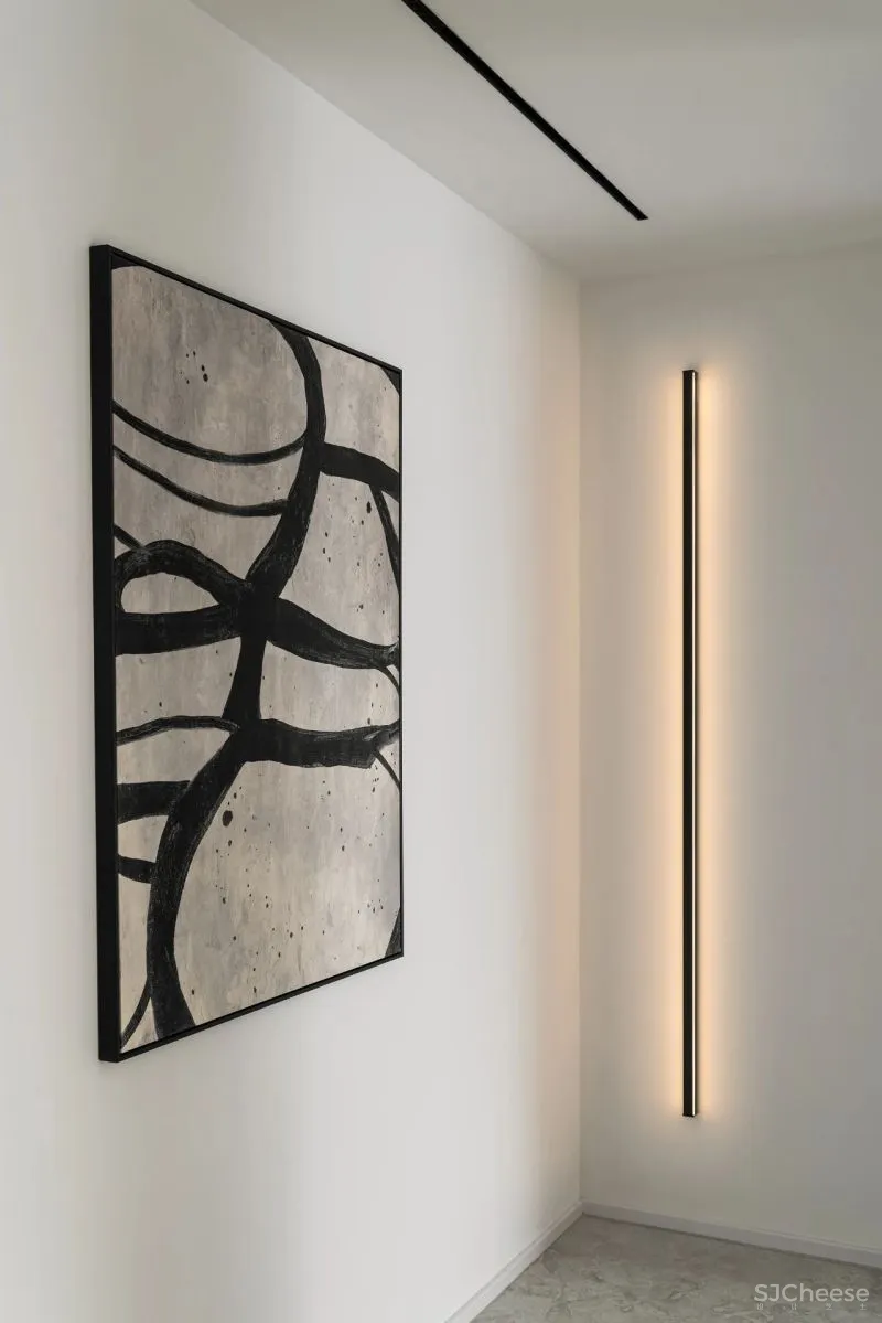 过道顶部的轨道照明一直延至墙面壁灯,提供照明同时强调动线引导。