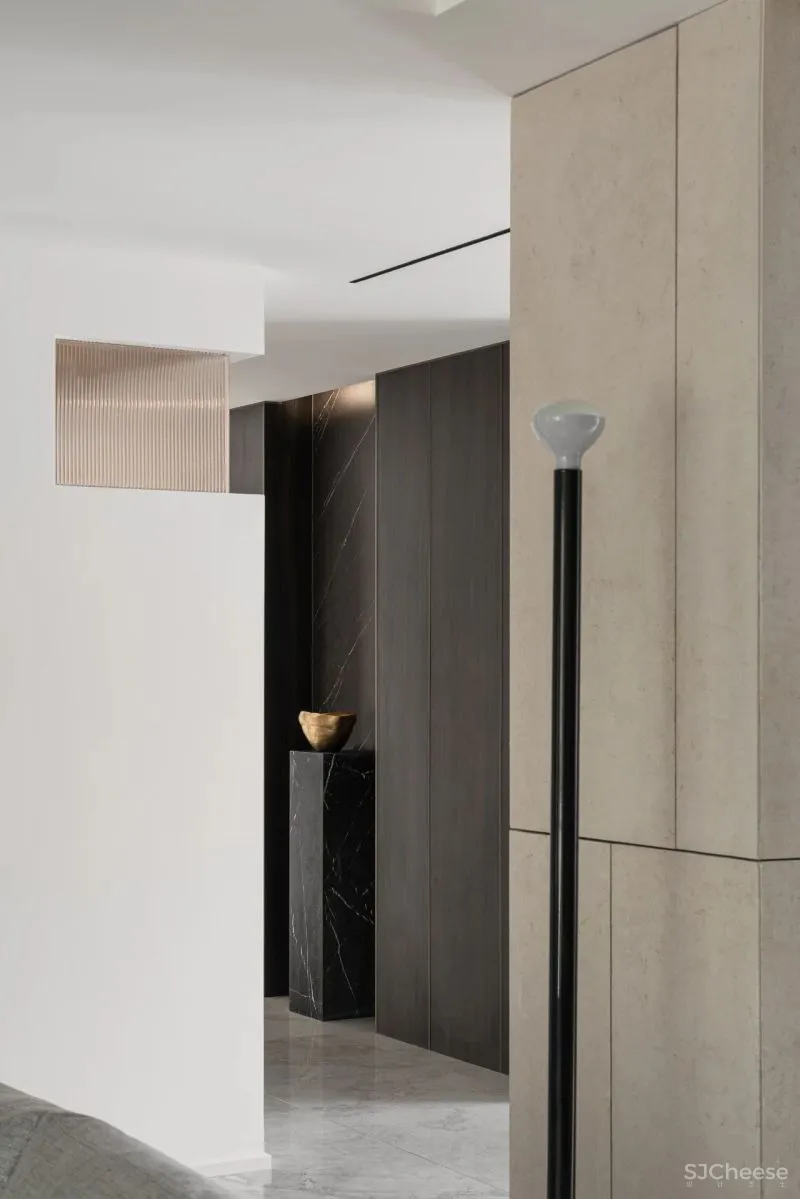 将北侧书房的墙体打开引入光线,消除长过道带来的幽闭感,同时墙面深浅对比的材质清晰地划分出动静分区。
