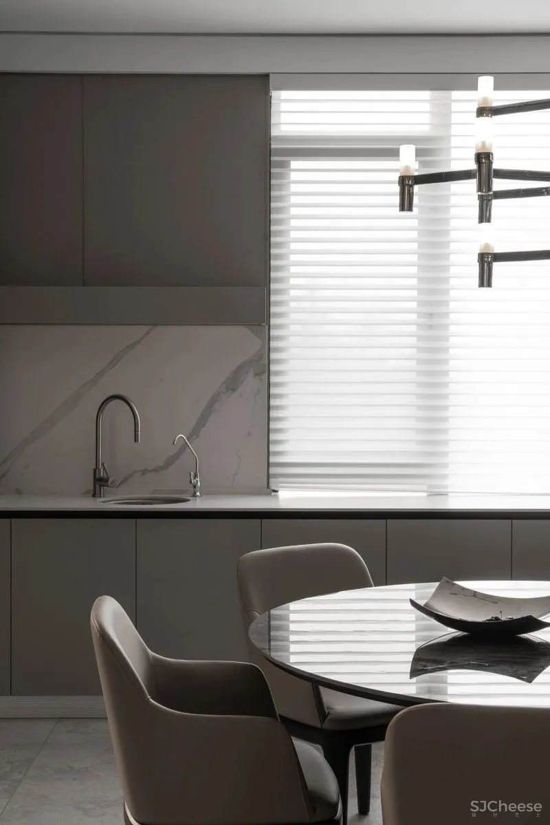 室内空间的处理,以留白、平和的石材、高对比的护墙为主要材质,整体保持沉稳的中性色调,以更好地呼应外部环境。