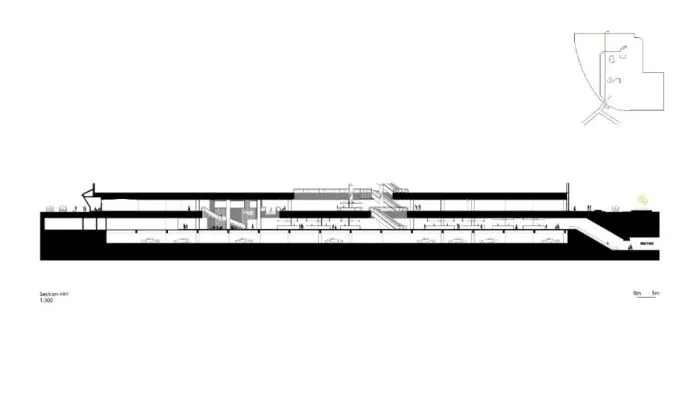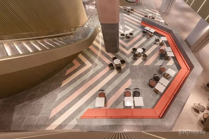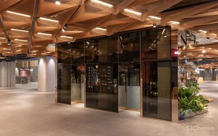 沿着一楼中庭金色城堡的楼梯向下步入负一层的钻食食集,像是走入树荫下的一个小广场.她是完全开放的,围合在一起的休息位,是在传达“We eat”的分享理念,也是与爱人、家人和朋友分享美食和社交活动的场所。 从连接地铁站的入口乘坐扶梯,缓缓进入钻食食集,这个行进过程更像是发现“美食宝藏”前的一段探寻之路,汇集式分布的橙色钻石网引导了这段路程。