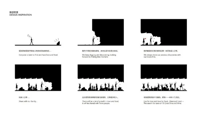 设计师申俊伟先生的灵感源自「寻味十九克拉」,以此来传达”唯有爱与美食不可辜负“,用大量可以刺激味蕾的橙色“钻石”网布满天花,让人像是置身于一个美食“宝藏”,去探索、发现、分享自己喜爱的美食;让心爱的人在这里相遇、朋友在这里相聚、家人在这里欢庆。