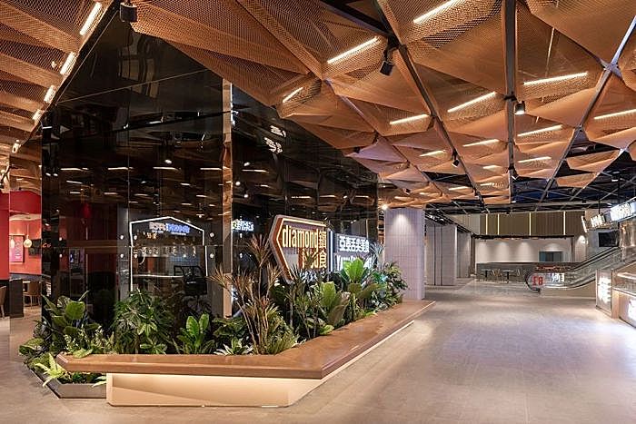 钻食食集,一个隐藏在长春「亚泰新动力」购物中心B1层的美食天地,整个楼层以「寻味十九克拉」为设计灵感,“十和九”是中文“食和酒”二字的谐音,代表美食, “克拉”是钻石的计重单位,既代表美食的最高等级,也是空间识别符号;她就像一个隐匿在钻石洞穴里的美食宝藏,大面积的橙色的“钻石”网天花, 熠熠生辉,汇集了上百种美食,食物滋滋作响,人间烟火气扑面而来,饮食男女即刻上演。